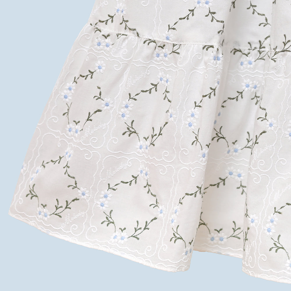 刺繍の花々が寄り添い、やさしい旋律のような物語を紡ぎます。
