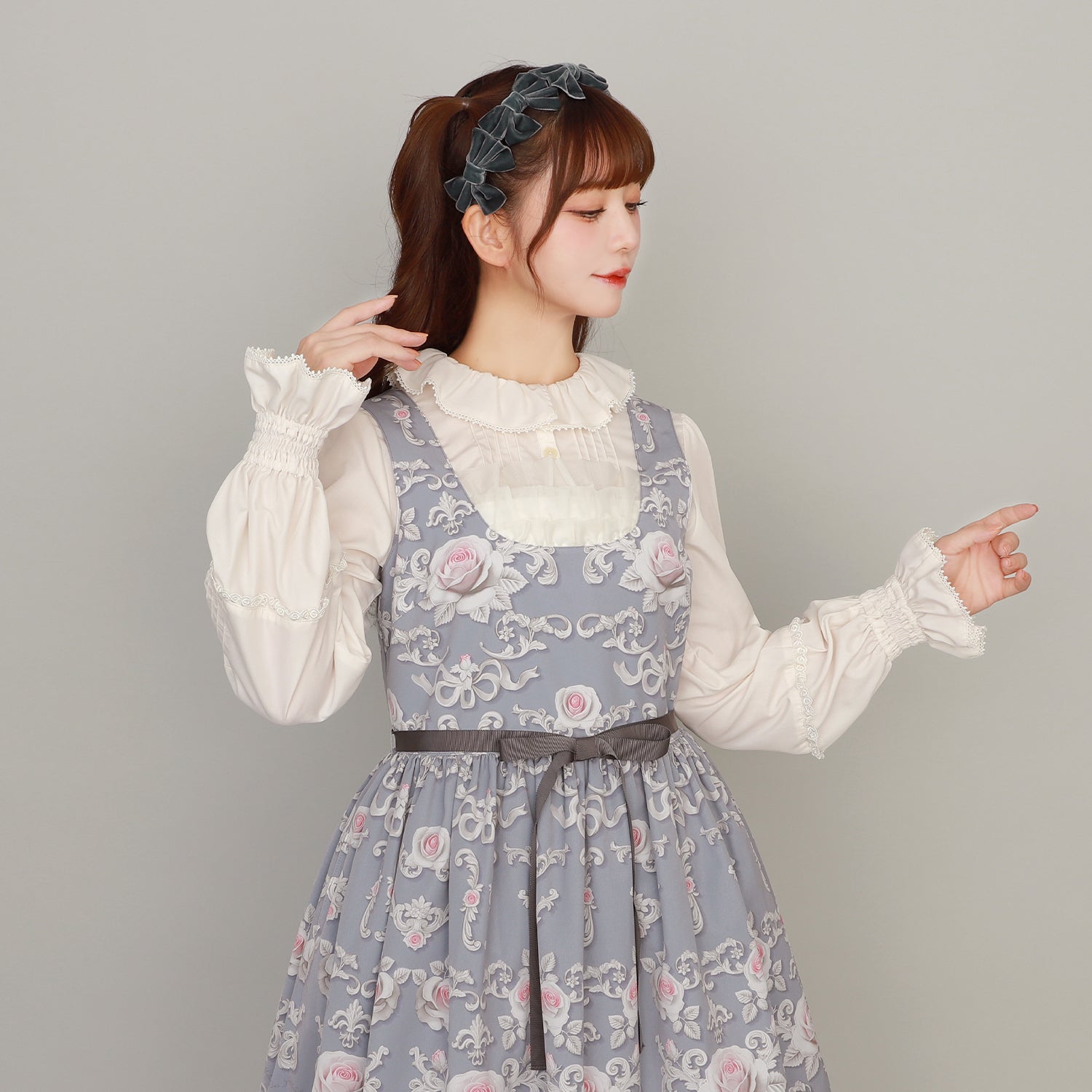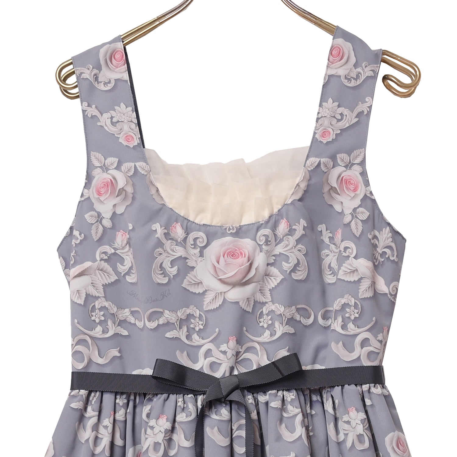 胸元のオーガンジーフリルがポイントのジャンパースカート。