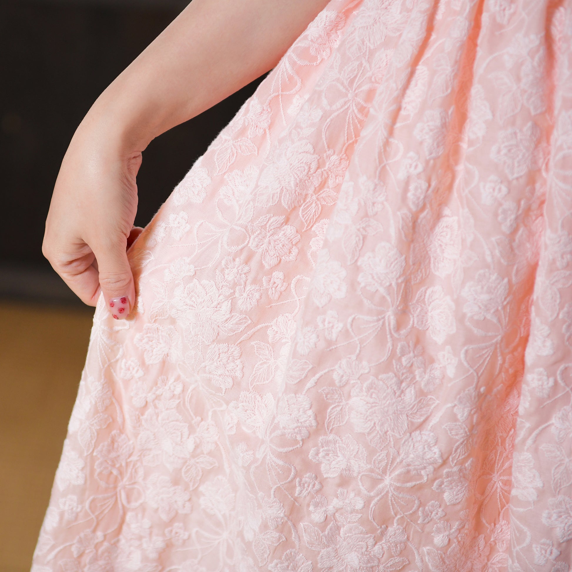 薔薇とリボンを刺繍したオリジナル生地を使用して仕立てました。