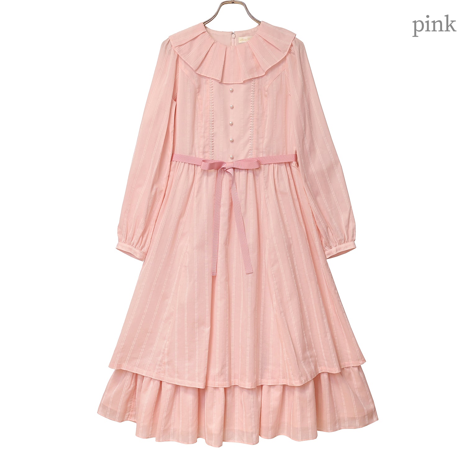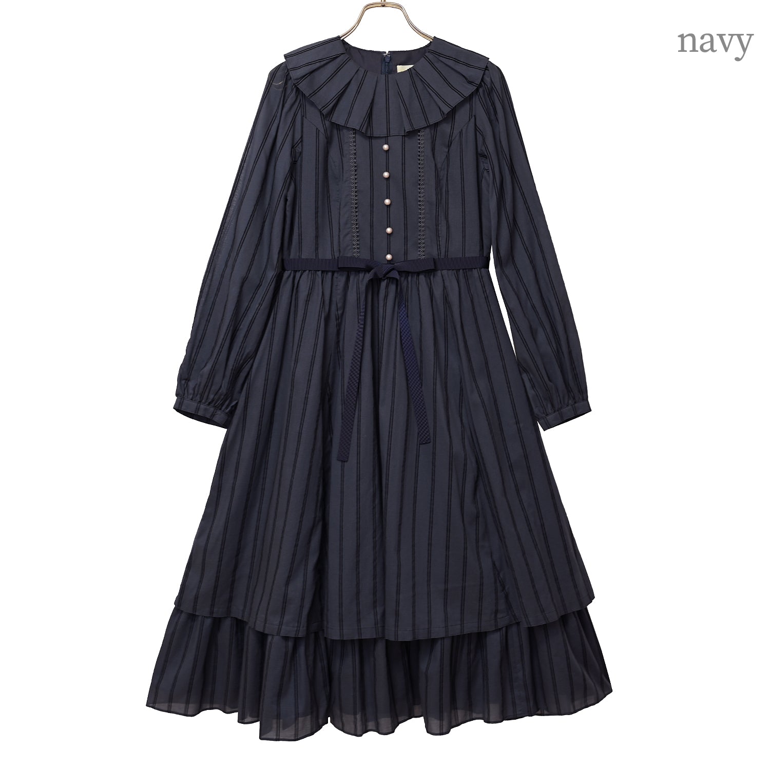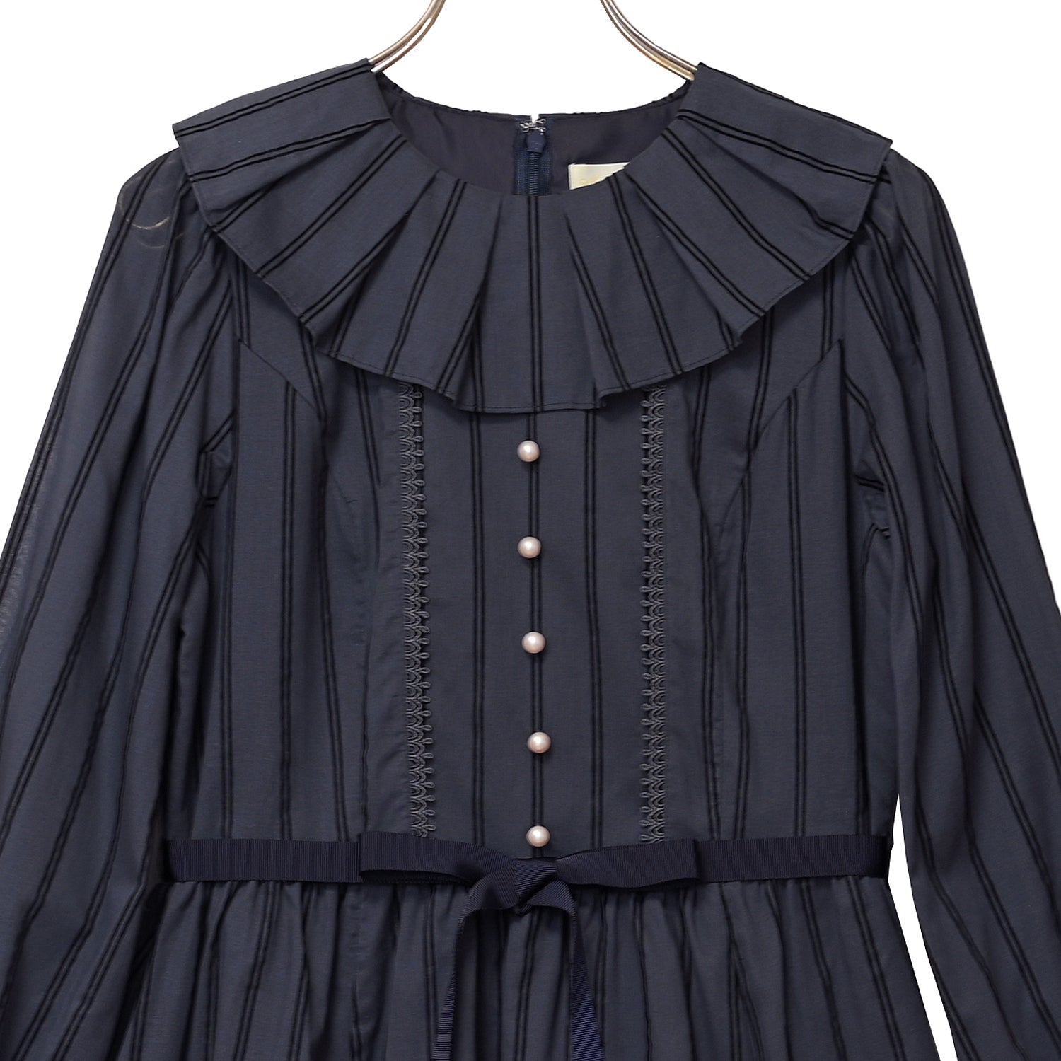 タックフリルカラーに飾りパールボタン、裾フリルとデザイン要素も満載。