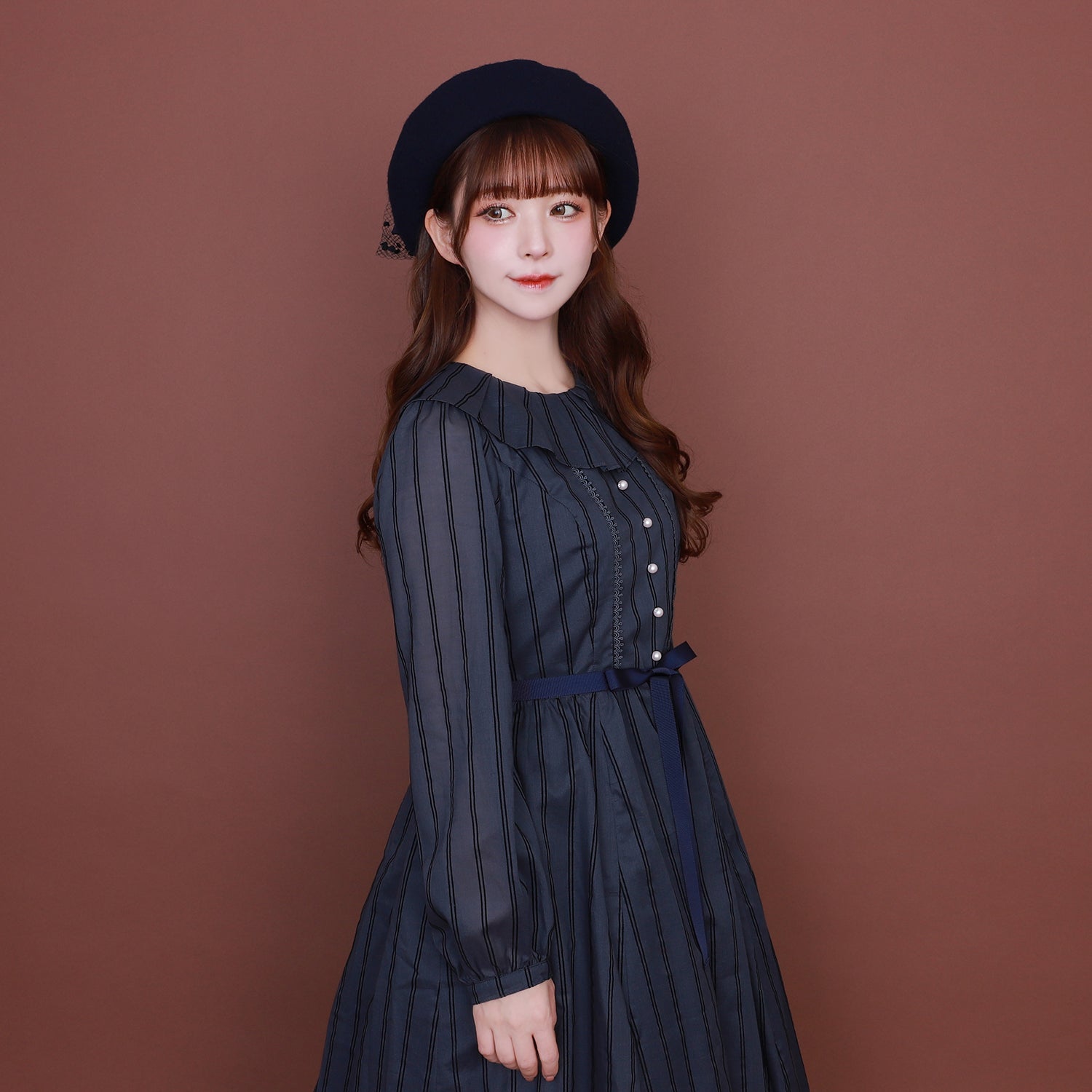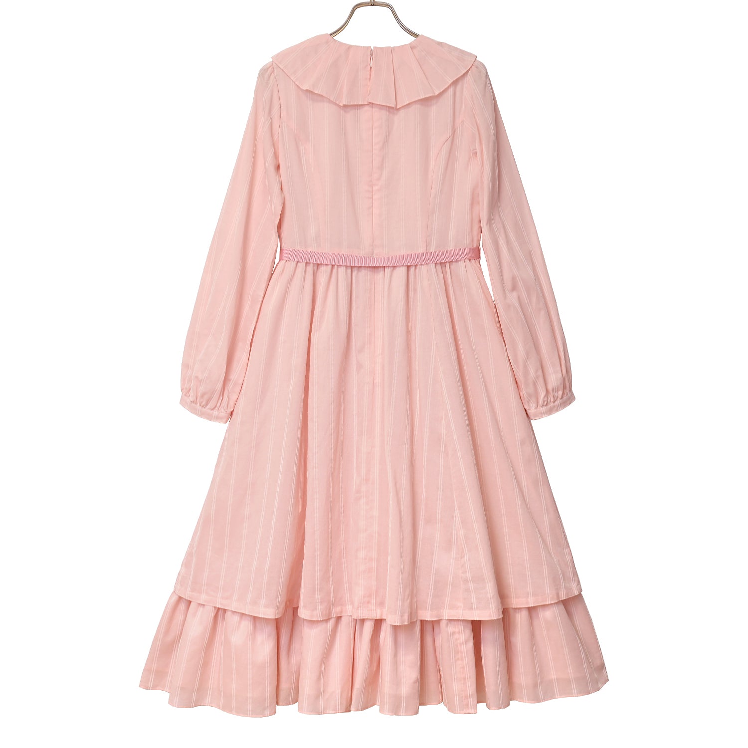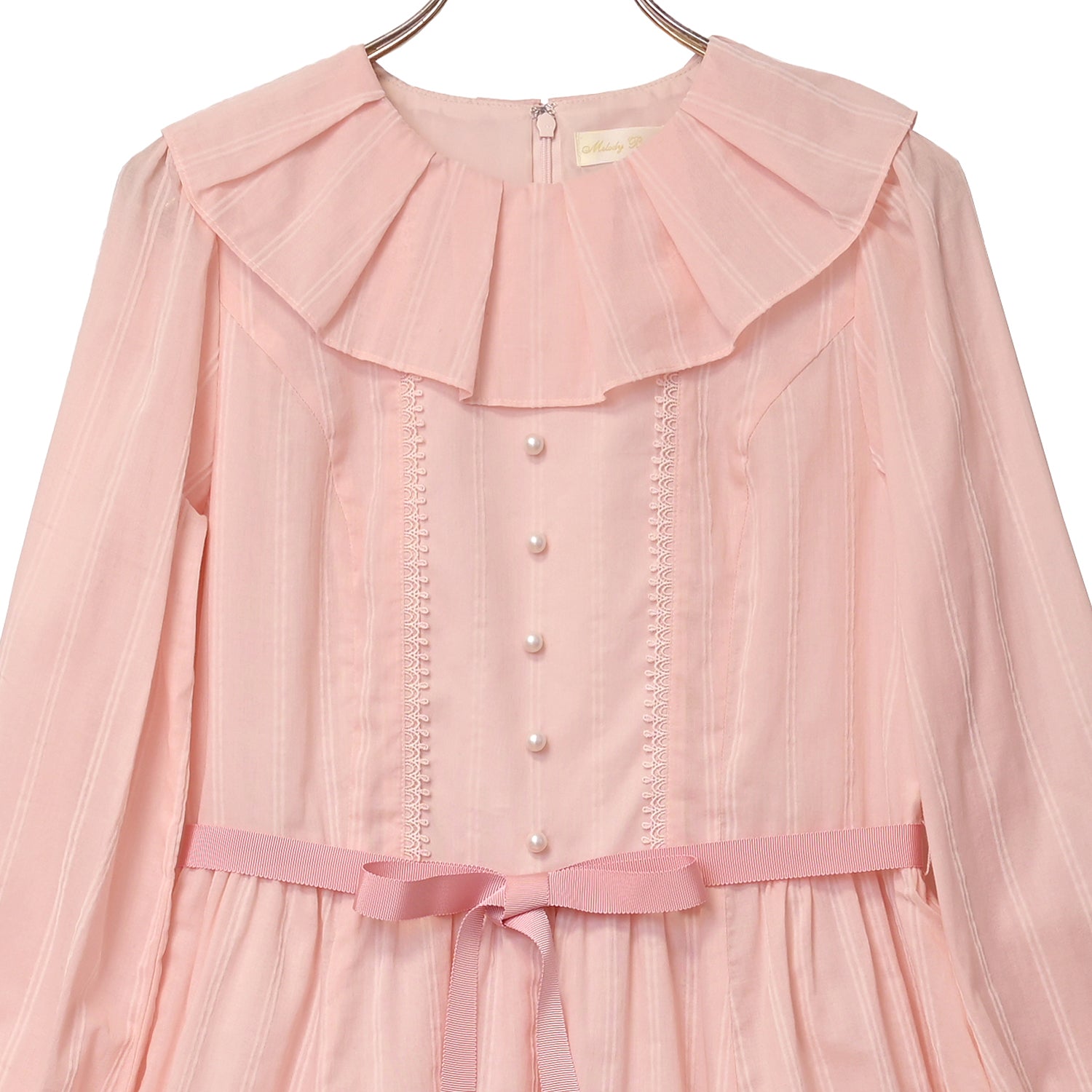 タックフリルカラーに飾りパールボタン、裾フリルとデザイン要素も満載。