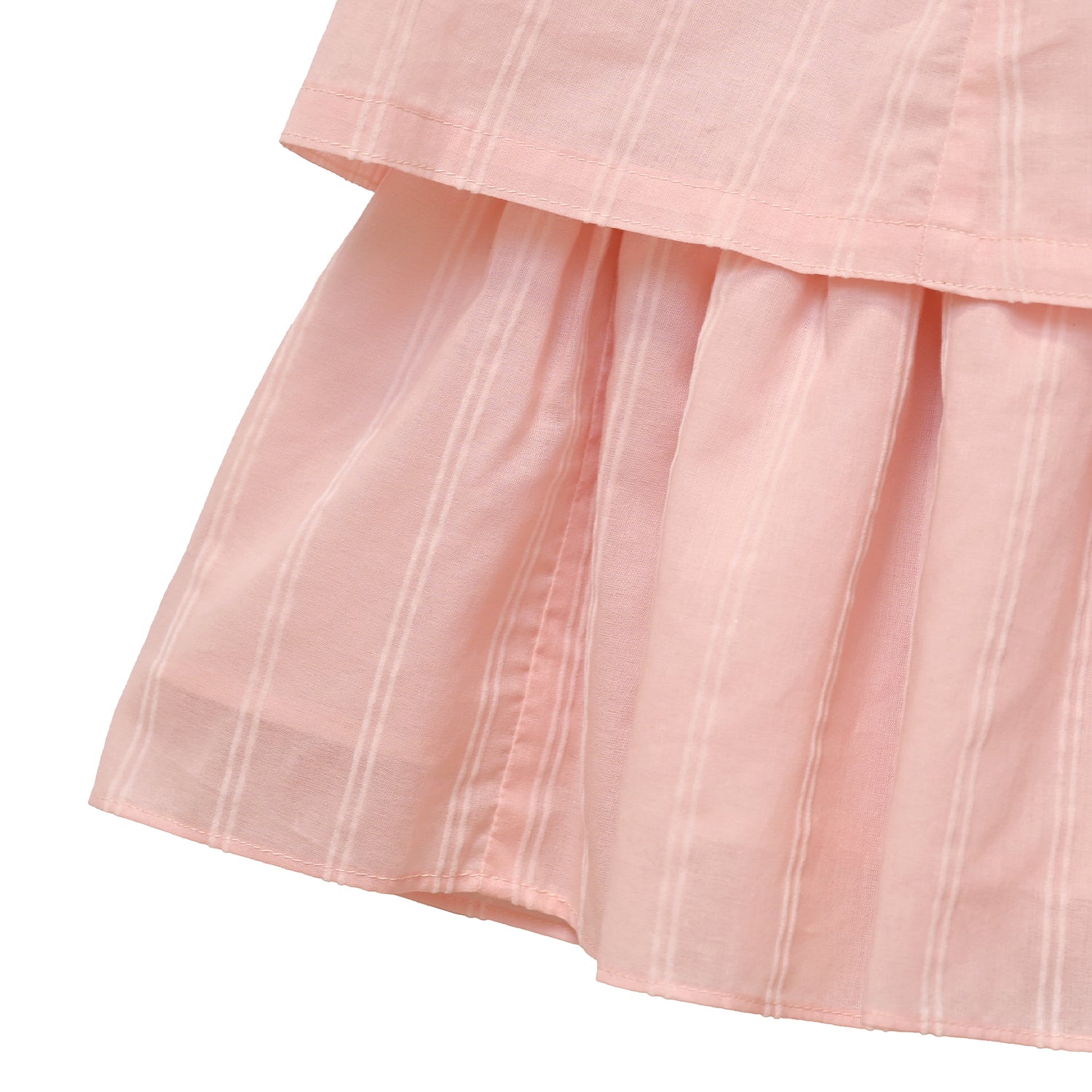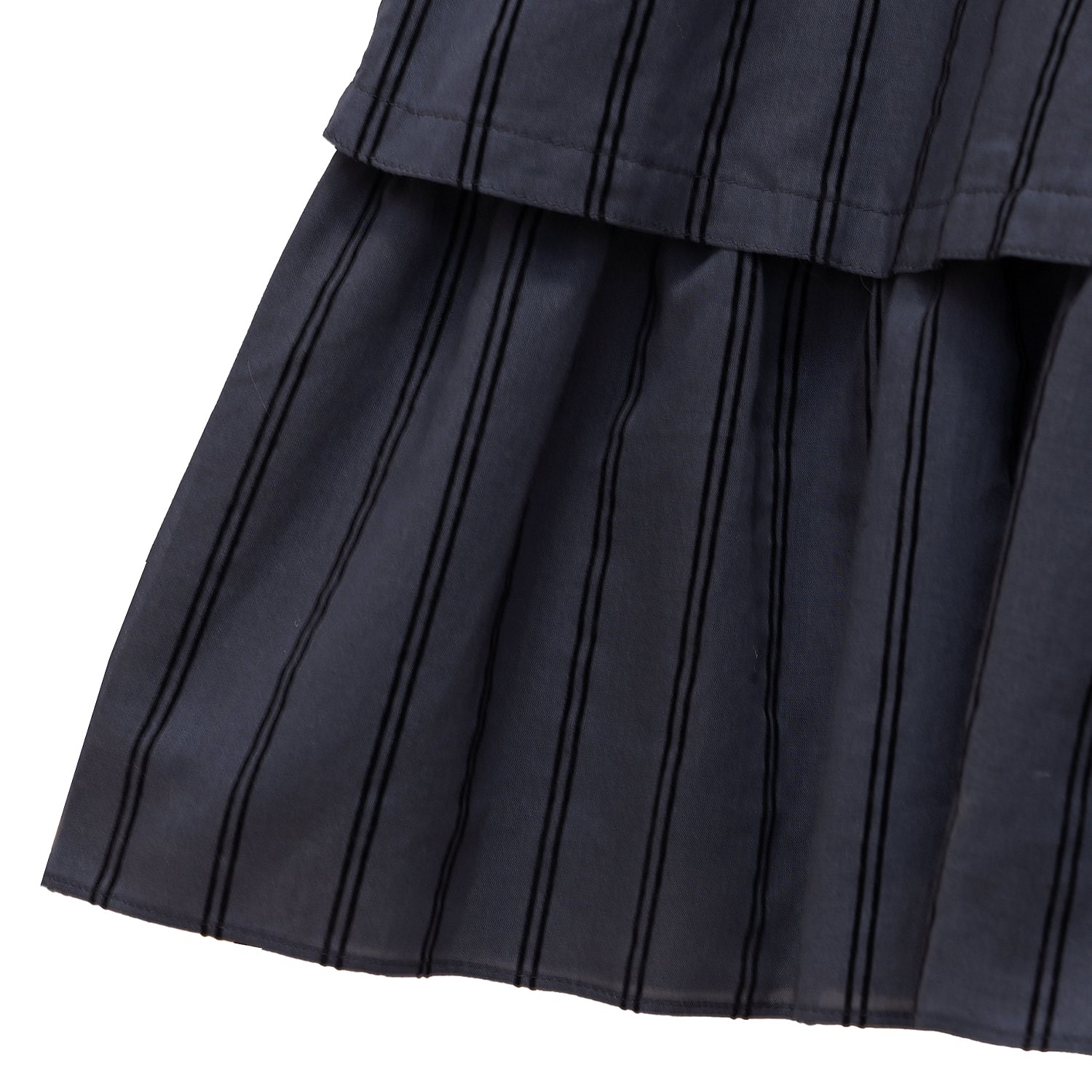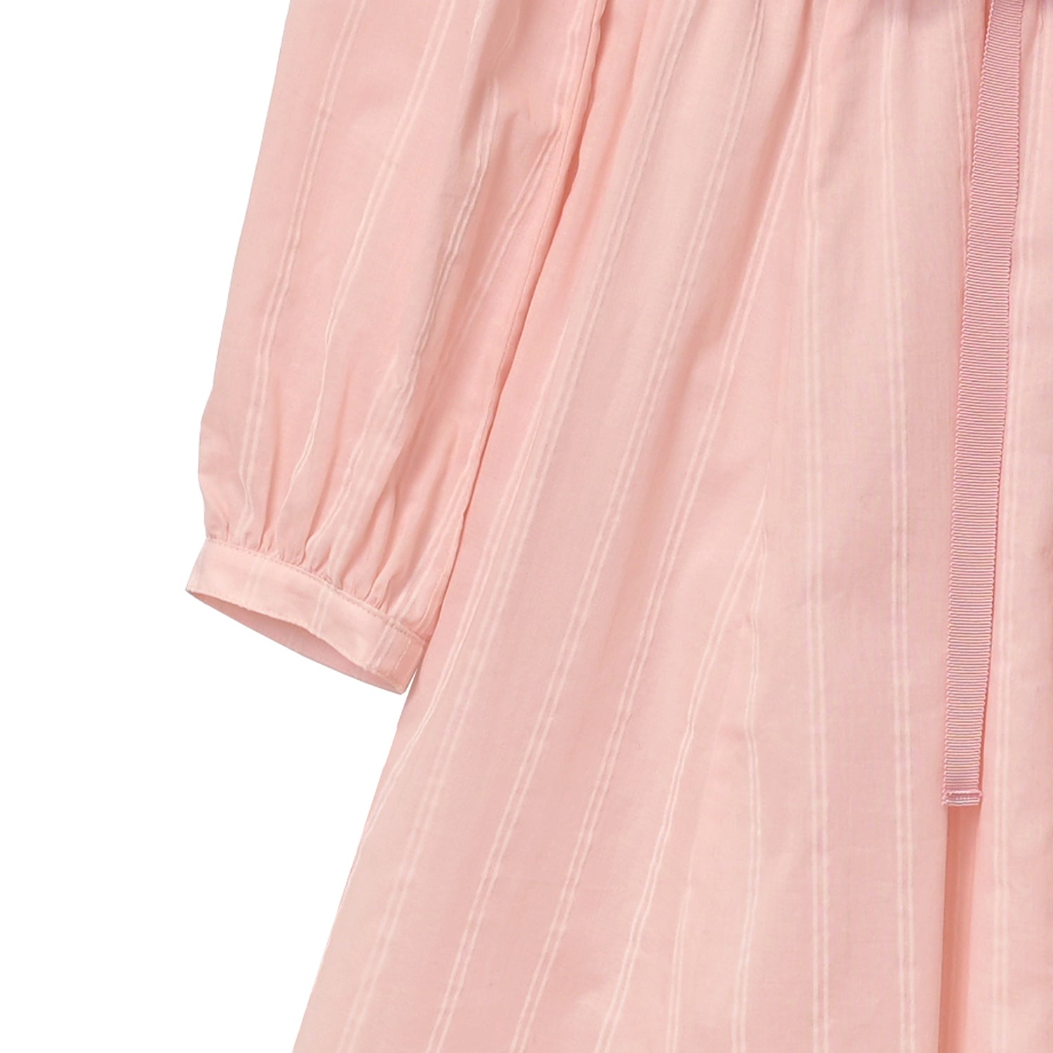 細い糸で織られたコットンローンに、ストライプ柄のフロッキープリントを施した生地で仕立てたワンピース。