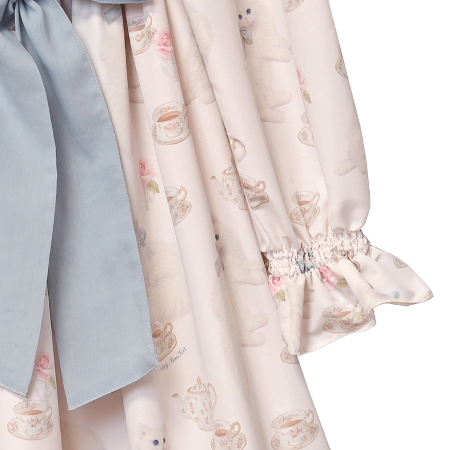 袖にはレースをあしらい、袖口はゴムシャーリングで隙のない可愛さ。