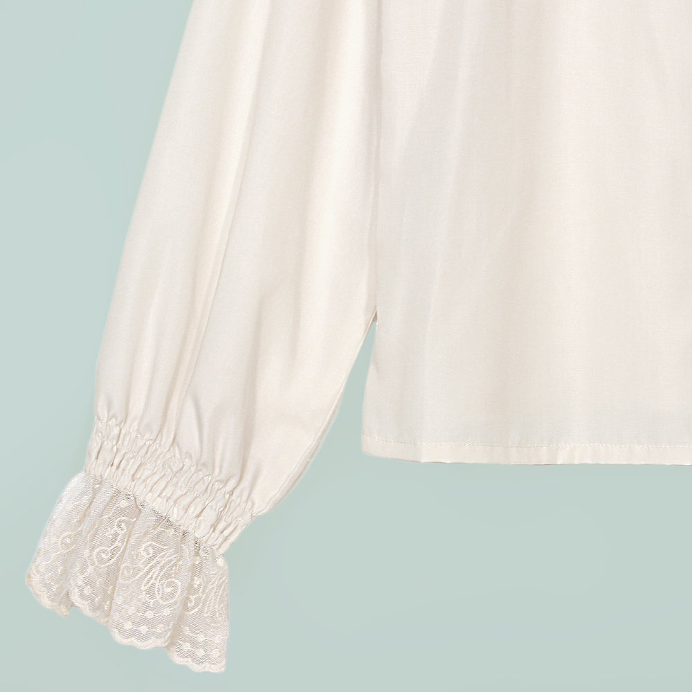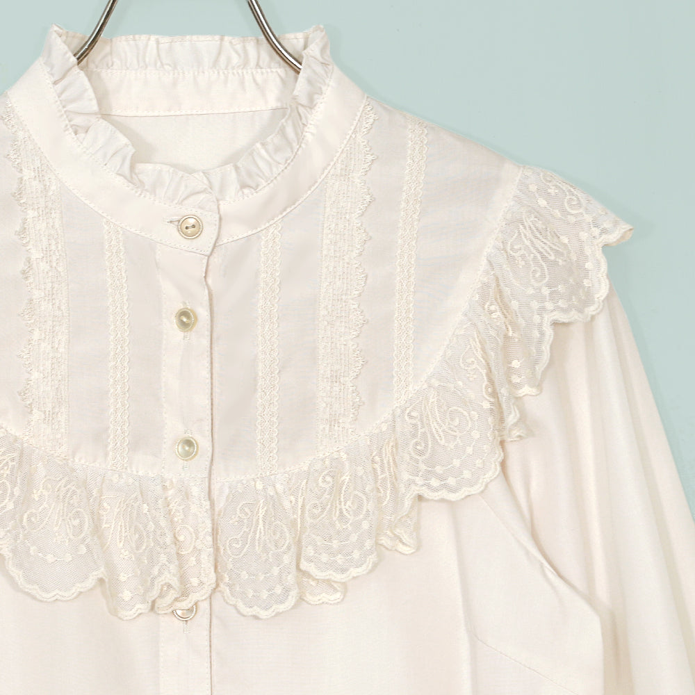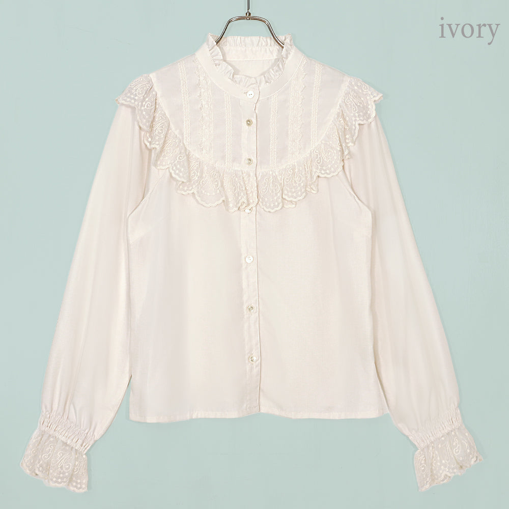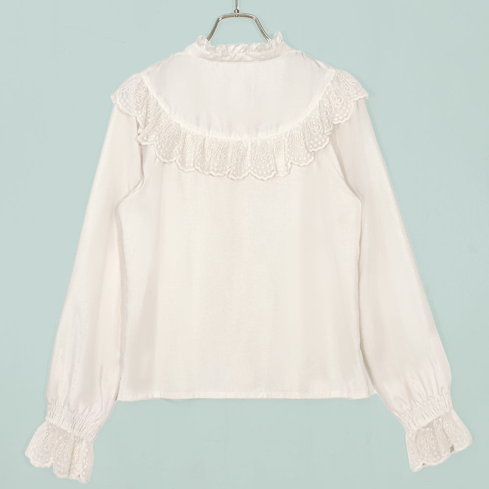 ラウンド型のヨーク切替がクラシカルな印象のスタンドカラーブラウス。