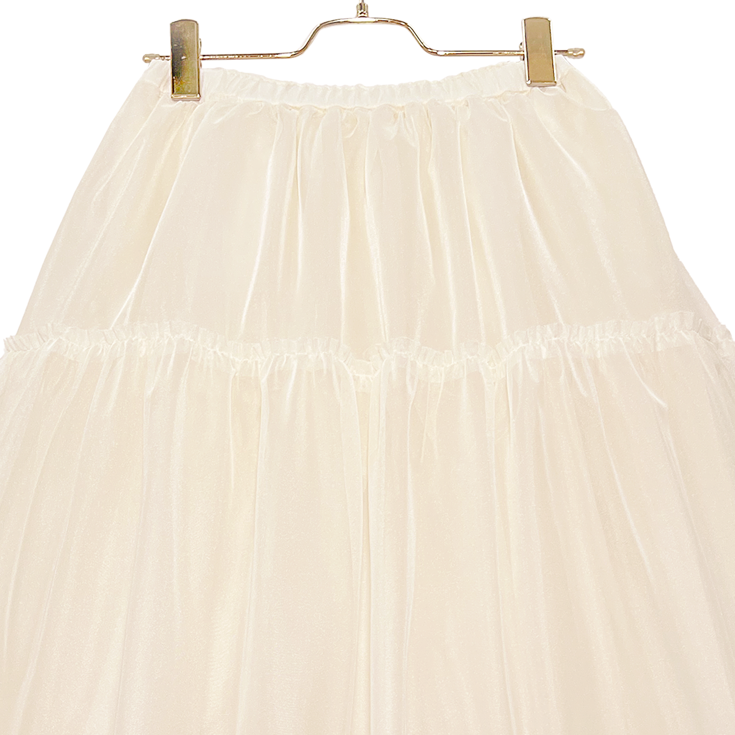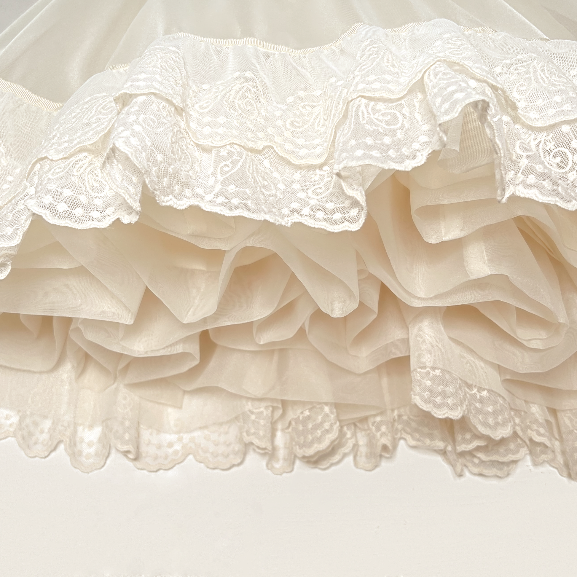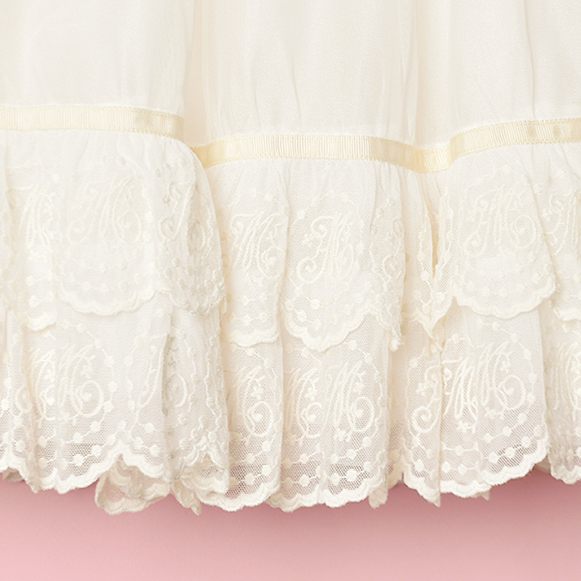 柔らかなチュールとオーガンジーを幾重にも重ね、裾にはオリジナルレースをふんだんにトッピング。ボリューム感を楽しめます。