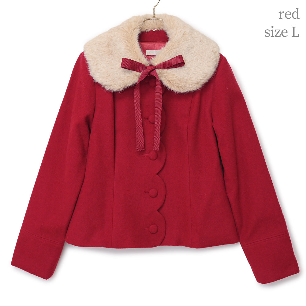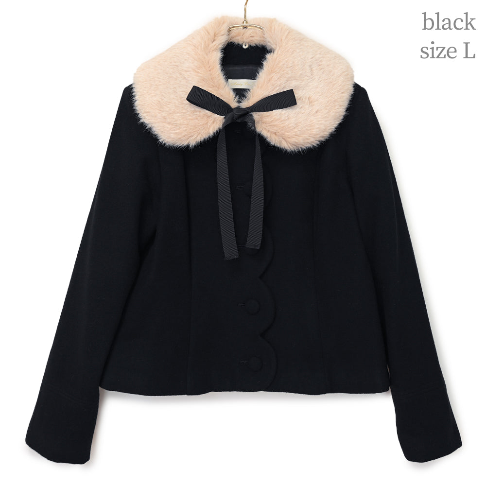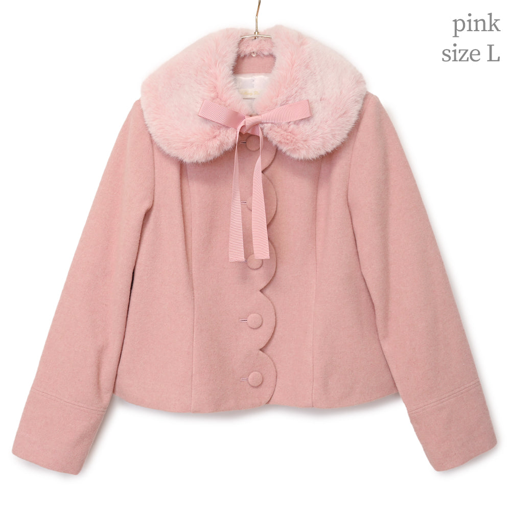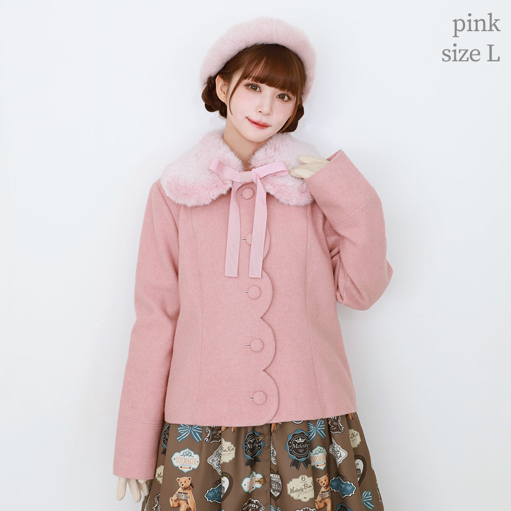 ふわふわのファーティペットとフロントのスカラップ切替が可愛らしいショートコート。