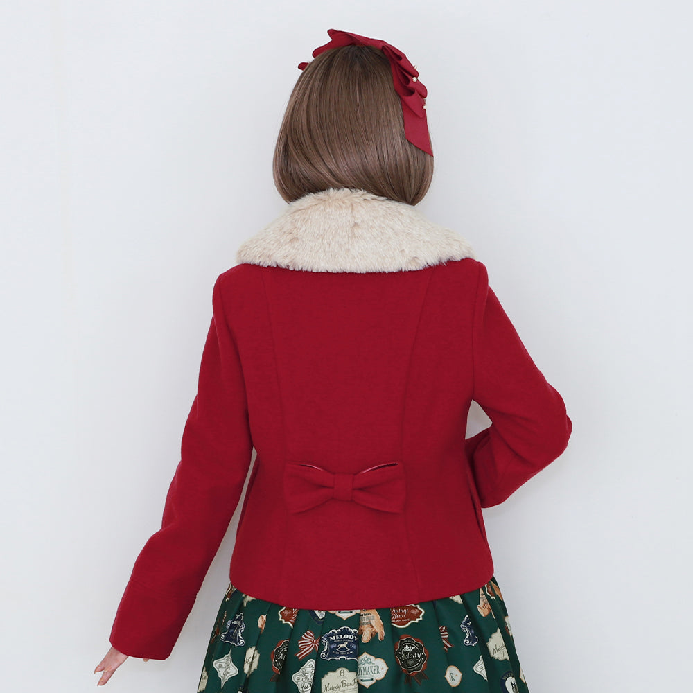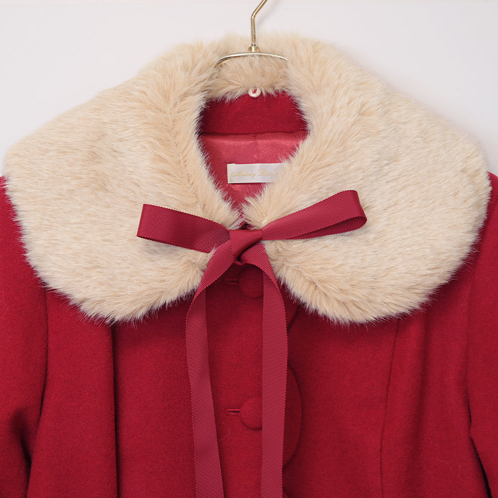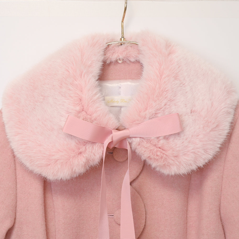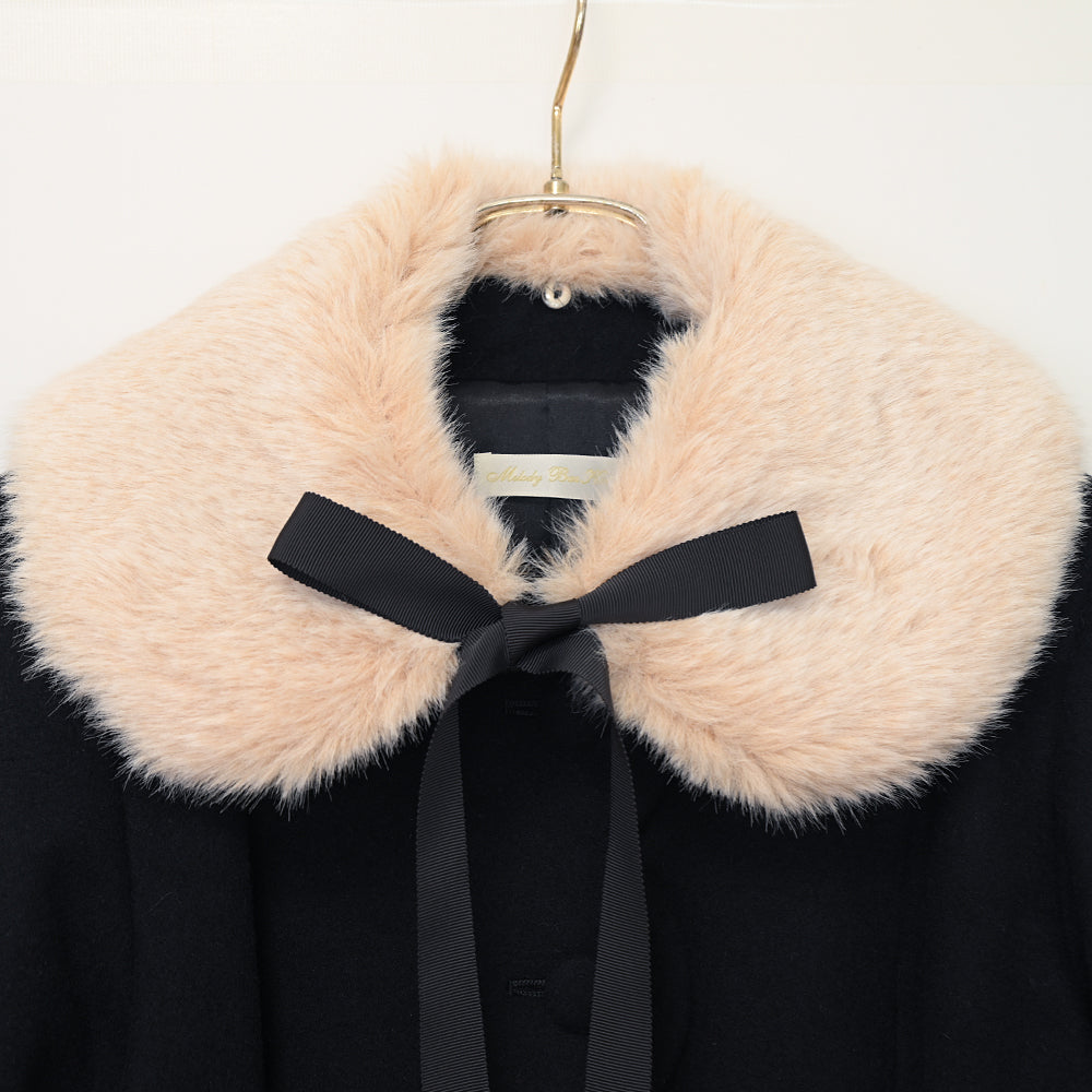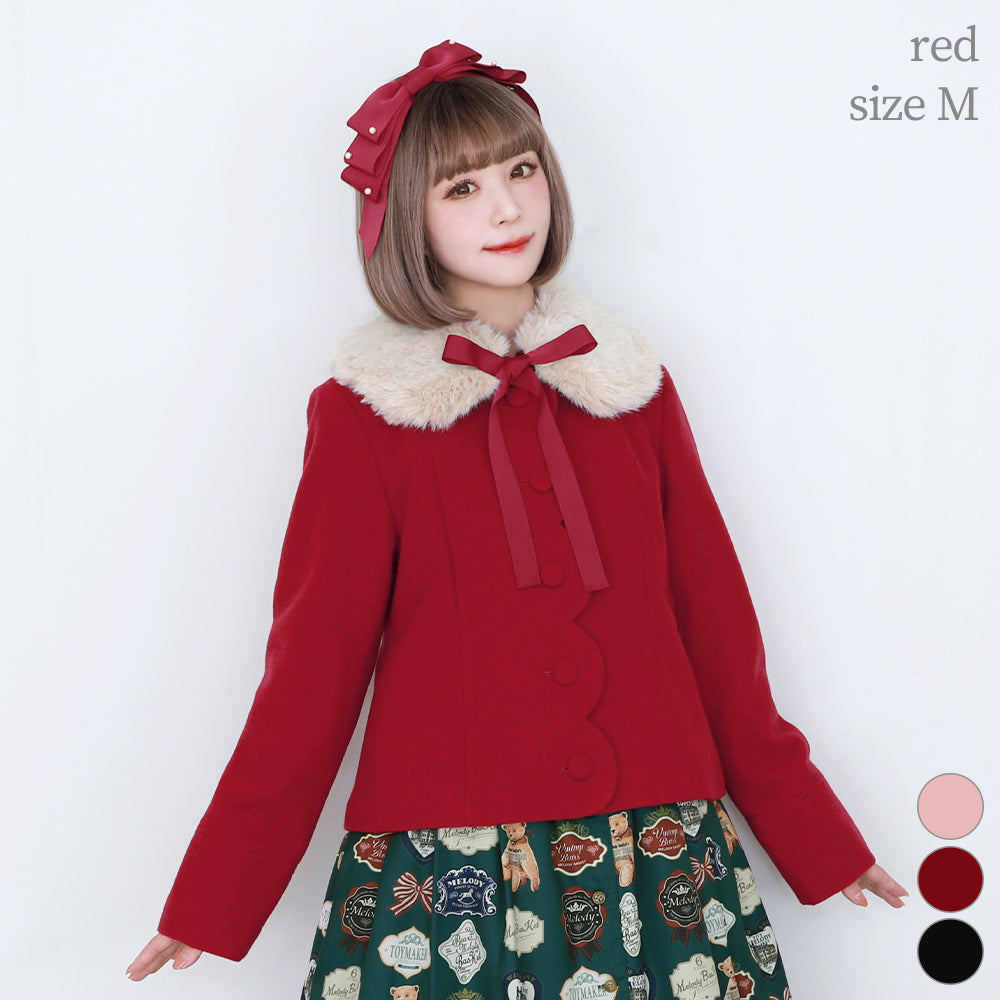 ふわふわのファーティペットとフロントのスカラップ切替が可愛らしいショートコート。