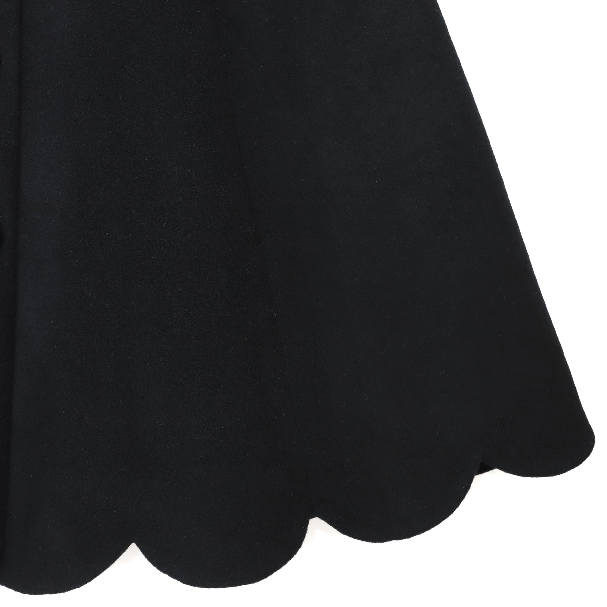 すっきりしたフレアーラインスカートの裾にスカラップを配し、シックな中に甘さをプラス。