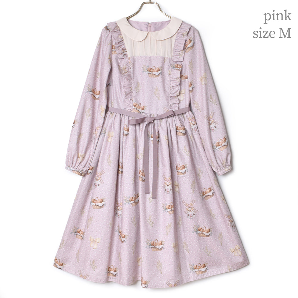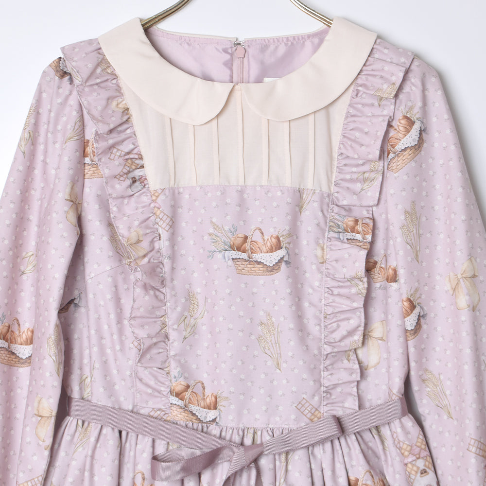 丸い襟と胸元の別地切替が可愛らしい長袖ワンピース。