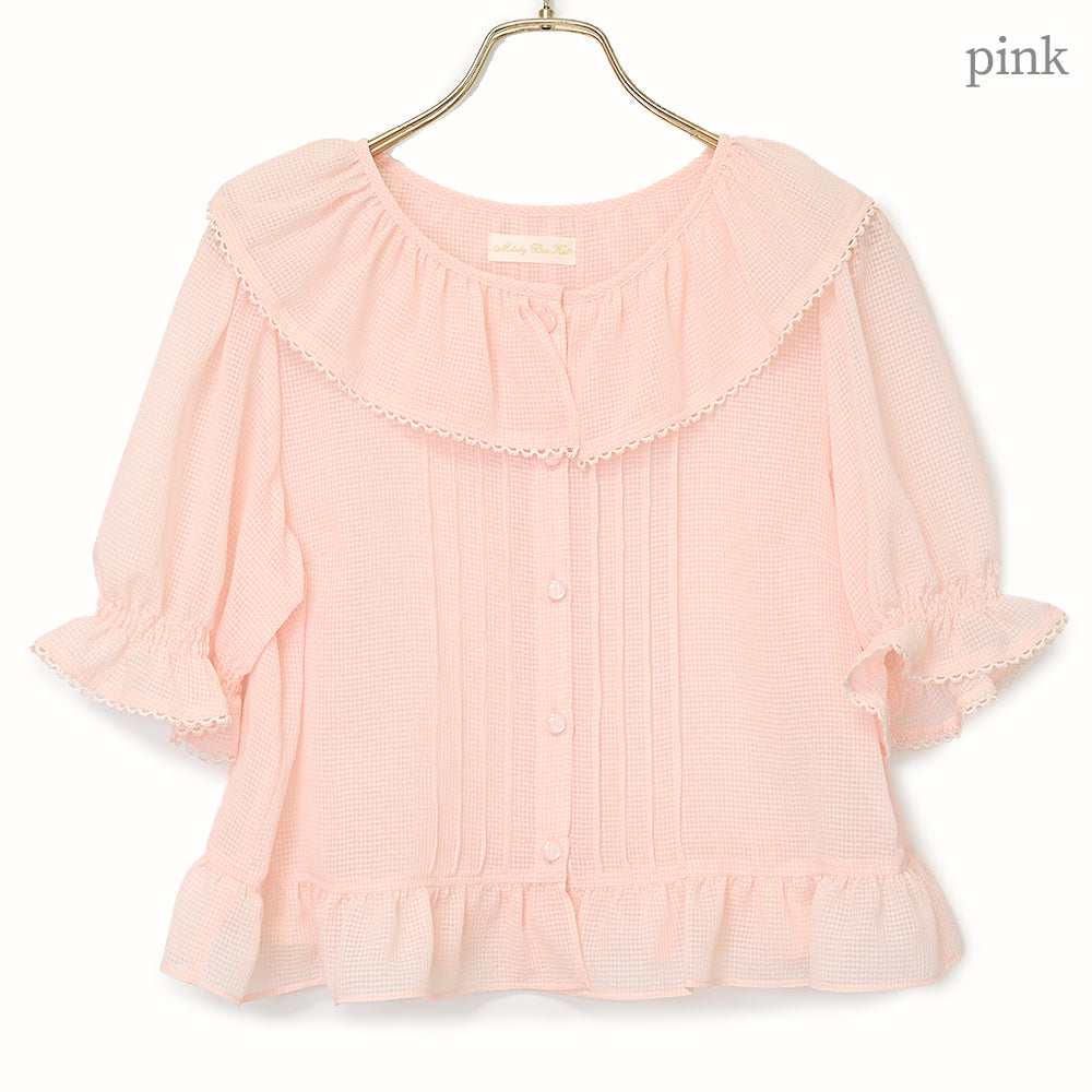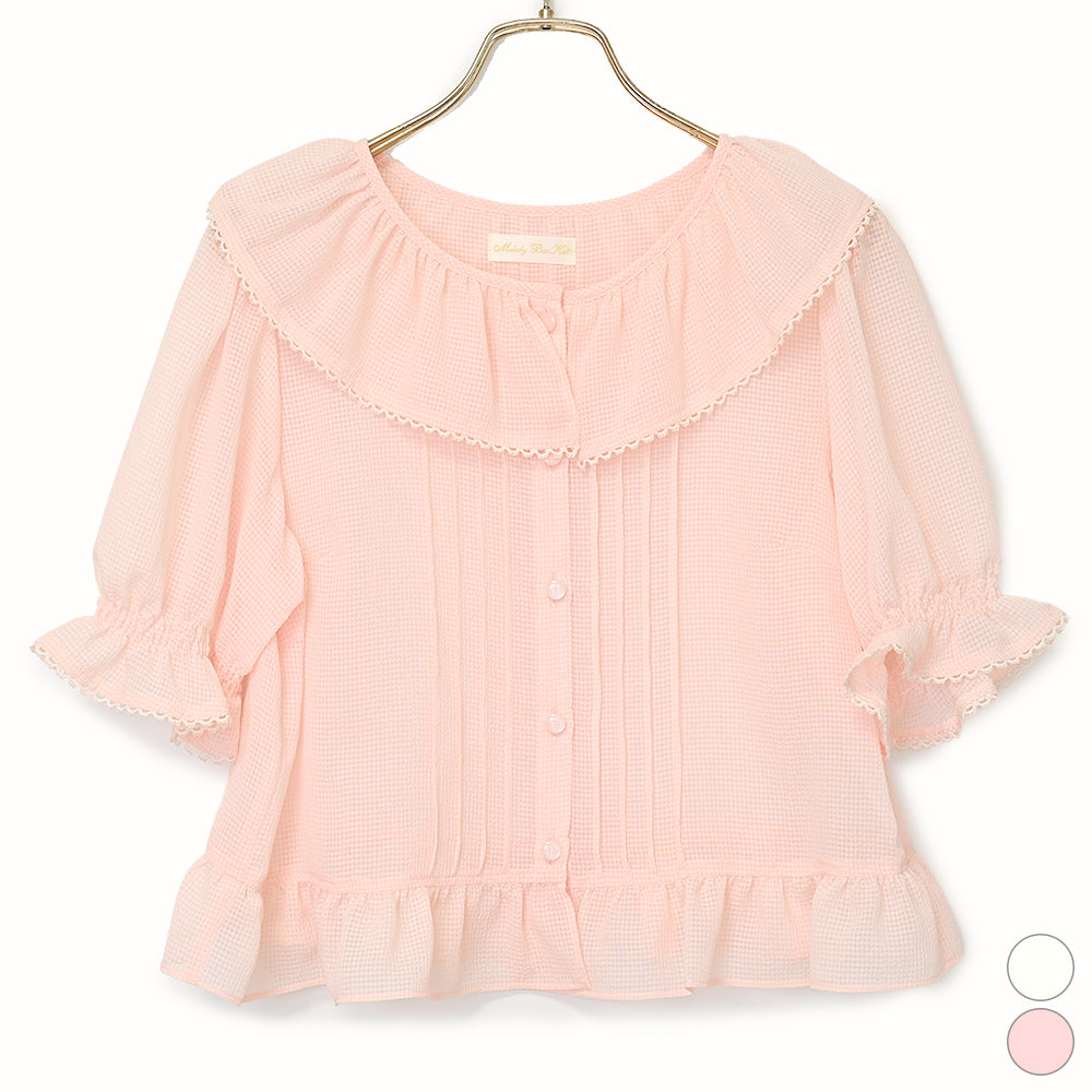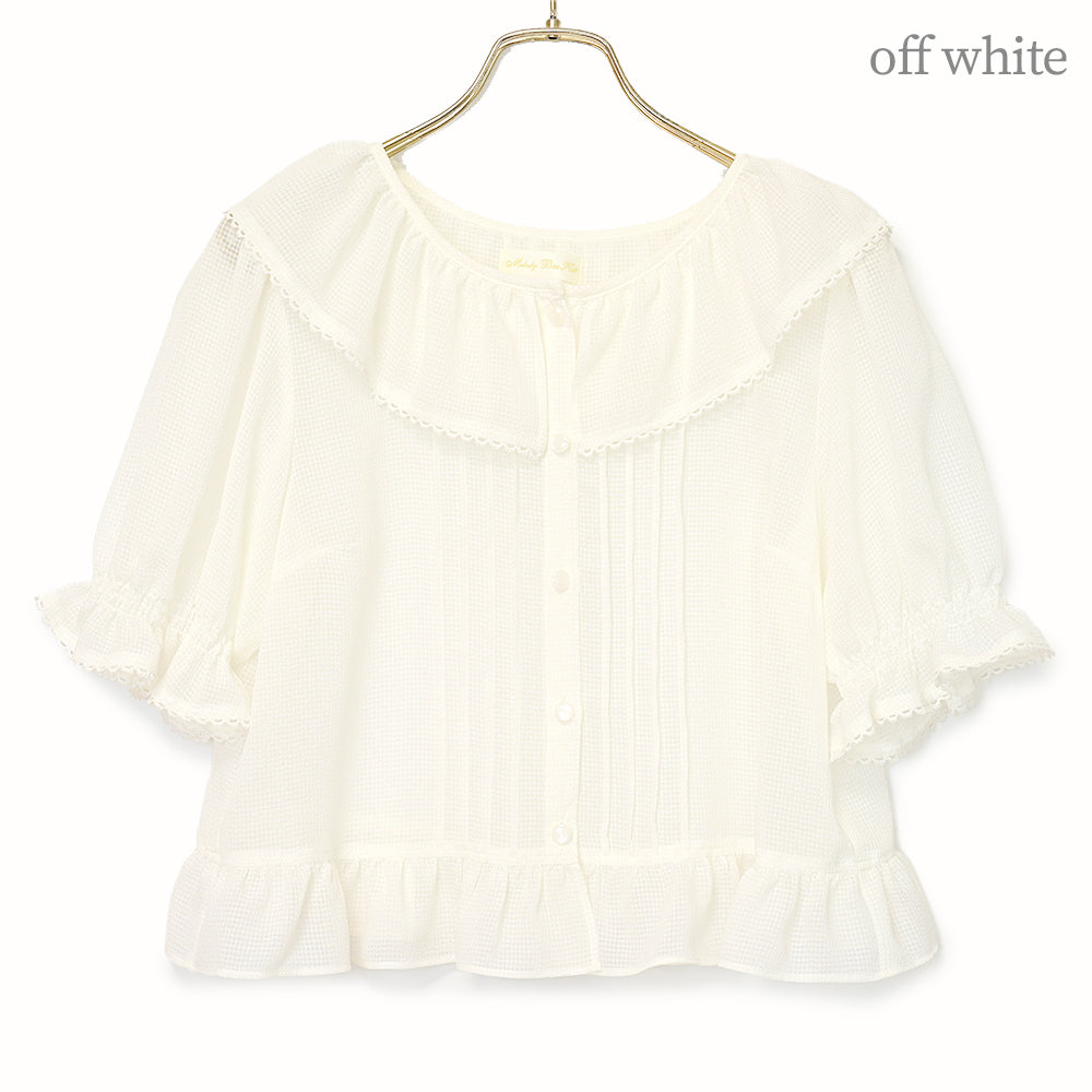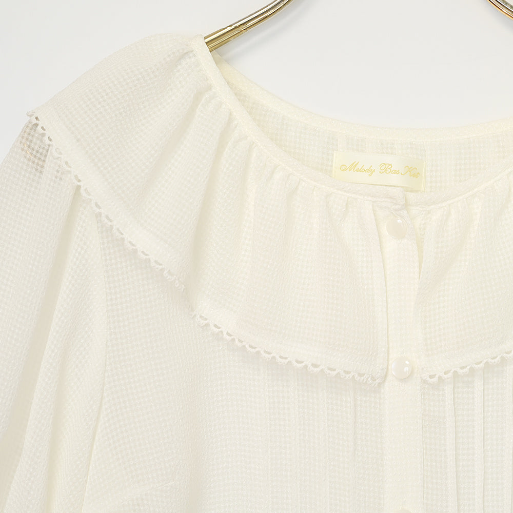 大ぶりのフリルとピンタックをあしらったオーバーブラウス。