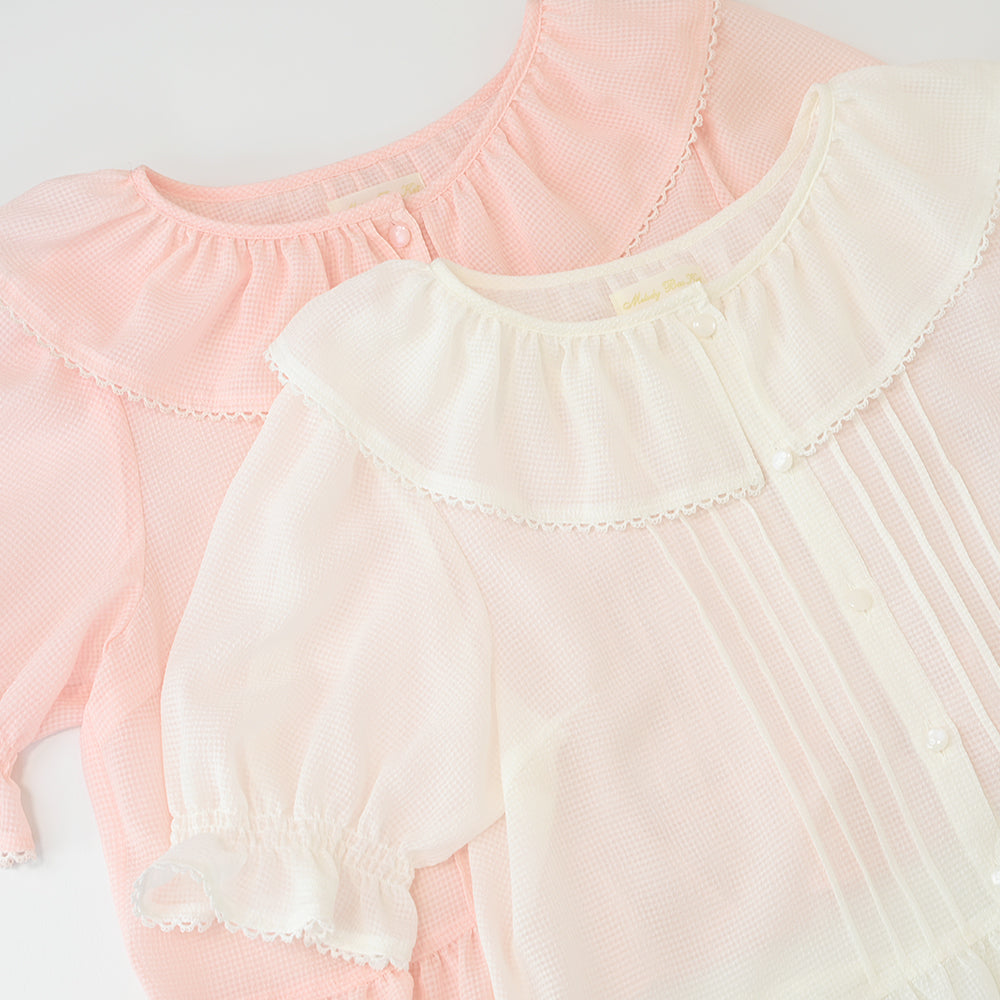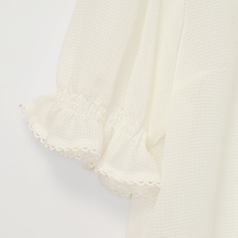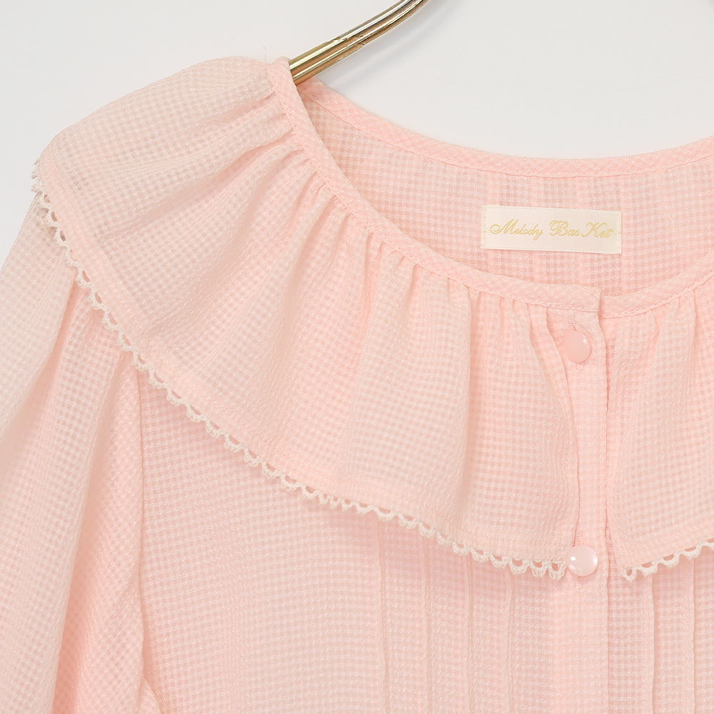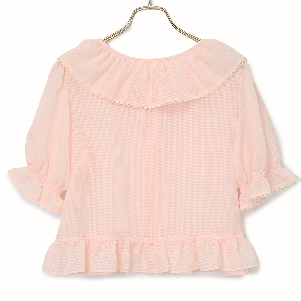 大ぶりのフリルとピンタックをあしらったオーバーブラウス。