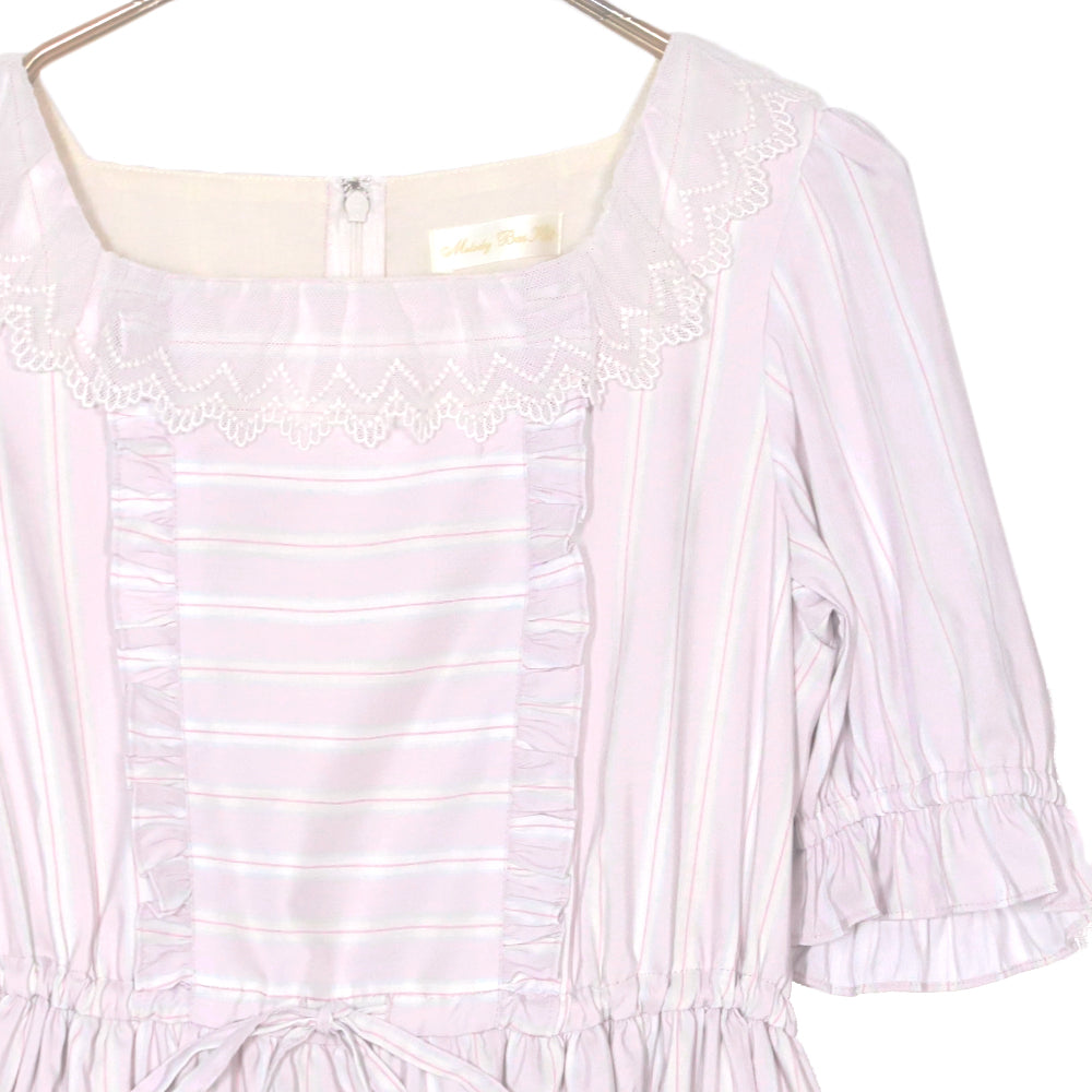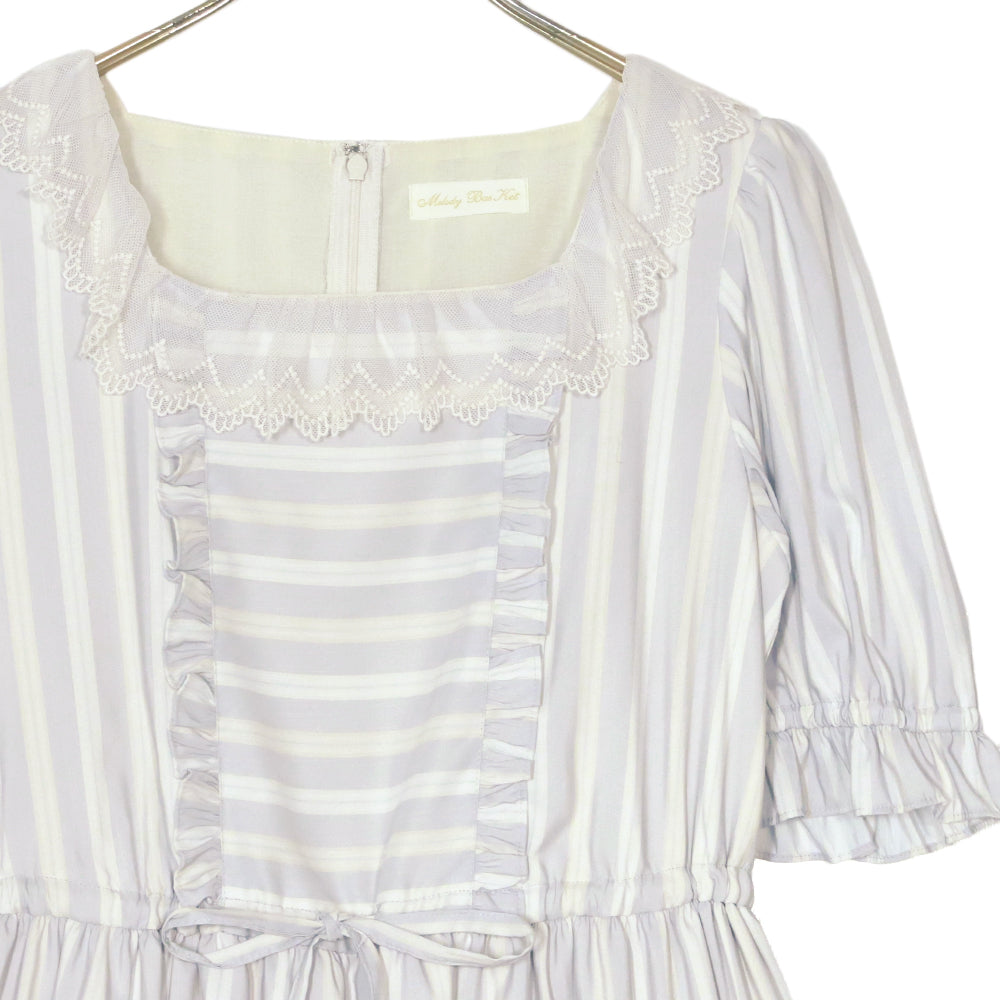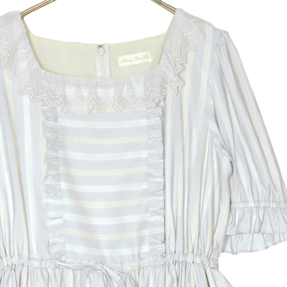 幅広のチュールレースで縁取られたスクエアネックのワンピース。