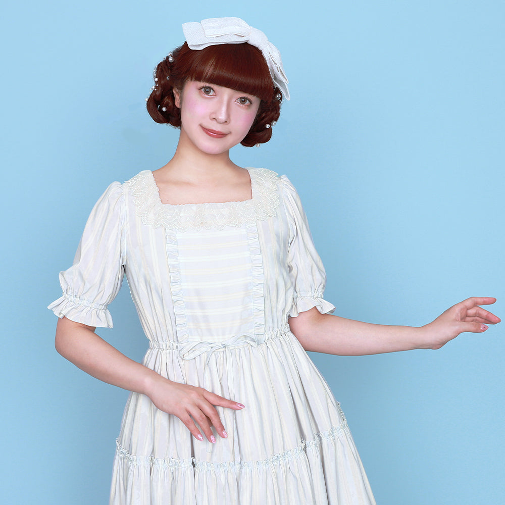胸元のフリルやスカートのフリル切り替えで、繊細な甘やかさをプラスしました。