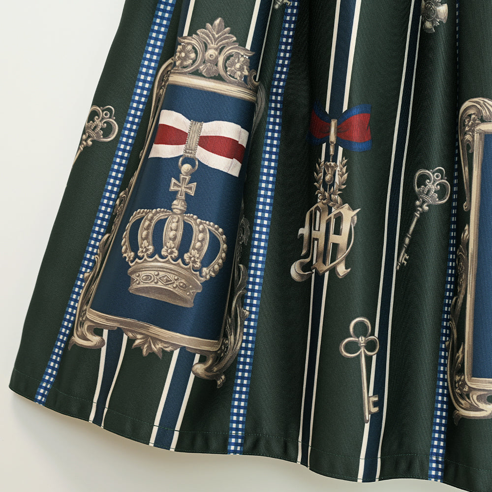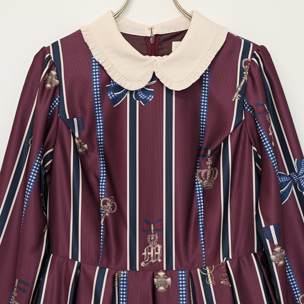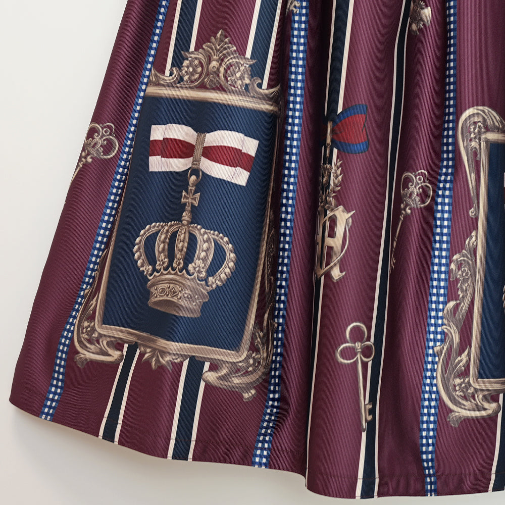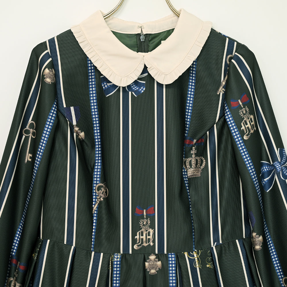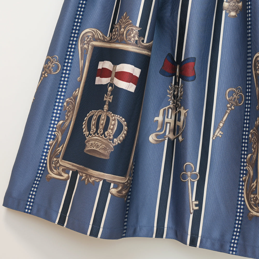 レジメンストライプに散りばめた紋章、鍵、リボン、、、