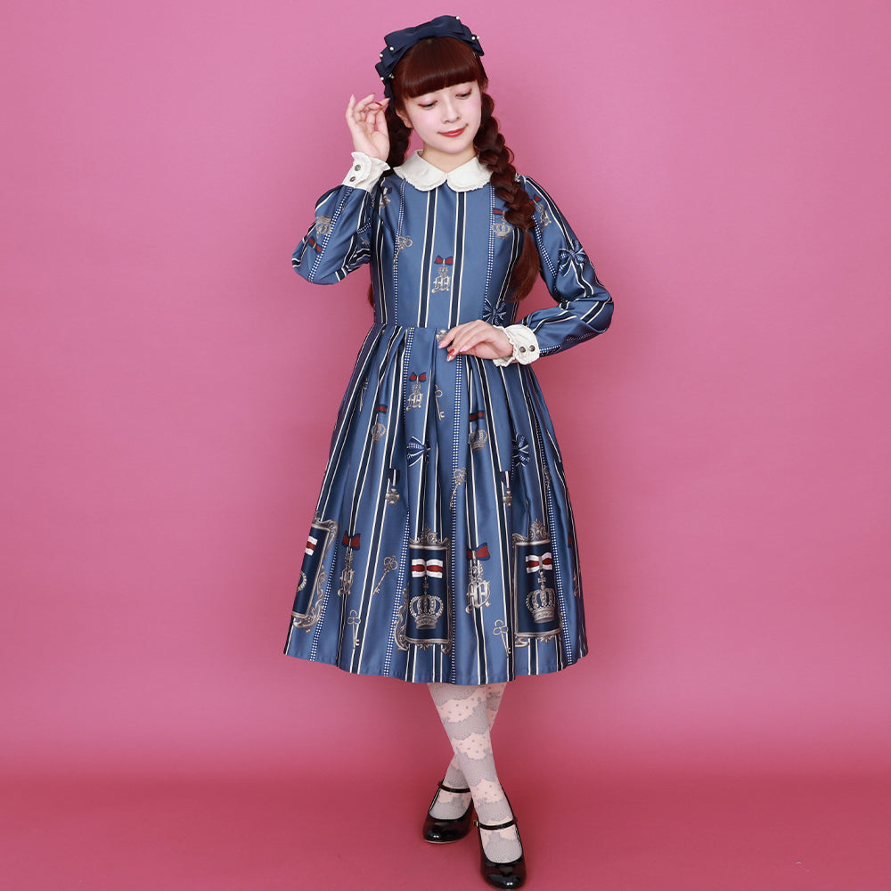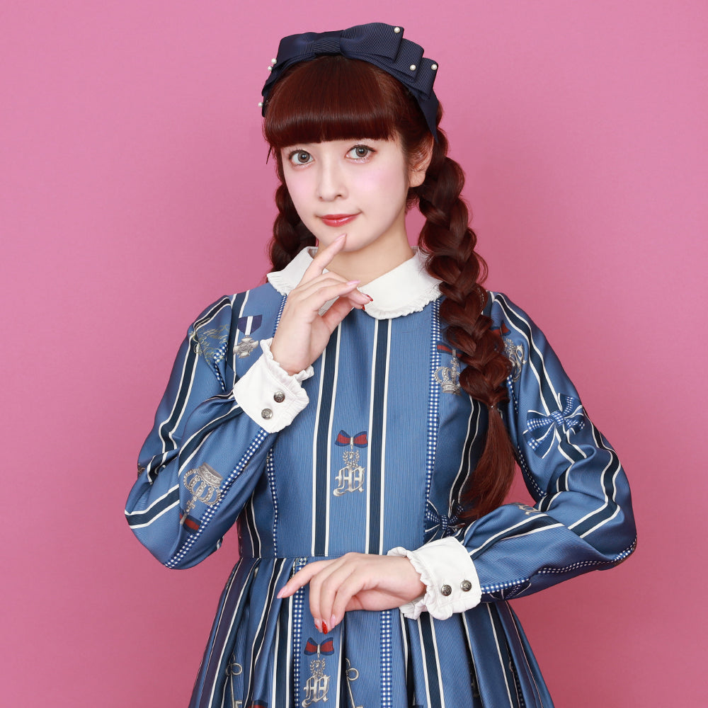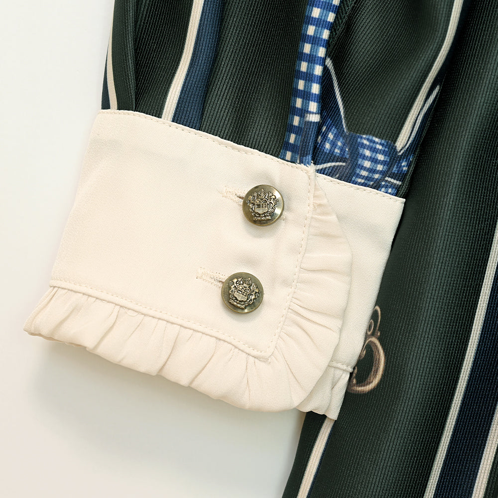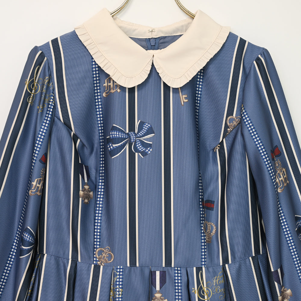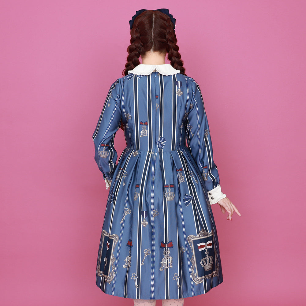 レジメンストライプに散りばめた紋章、鍵、リボン、、、