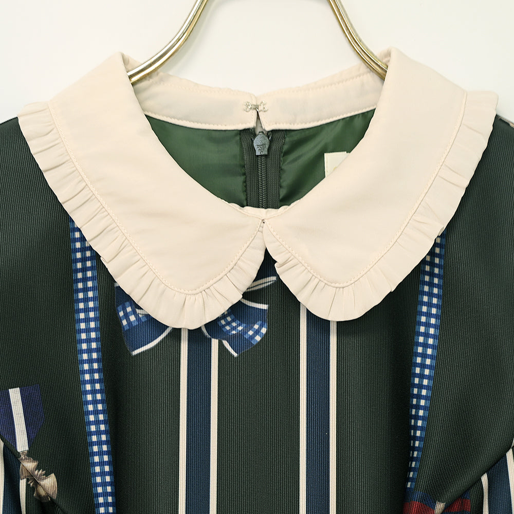 後ろファスナー開閉仕様。袖口ボタン開閉仕様。スカート右脇ポケット付き。国内生産。