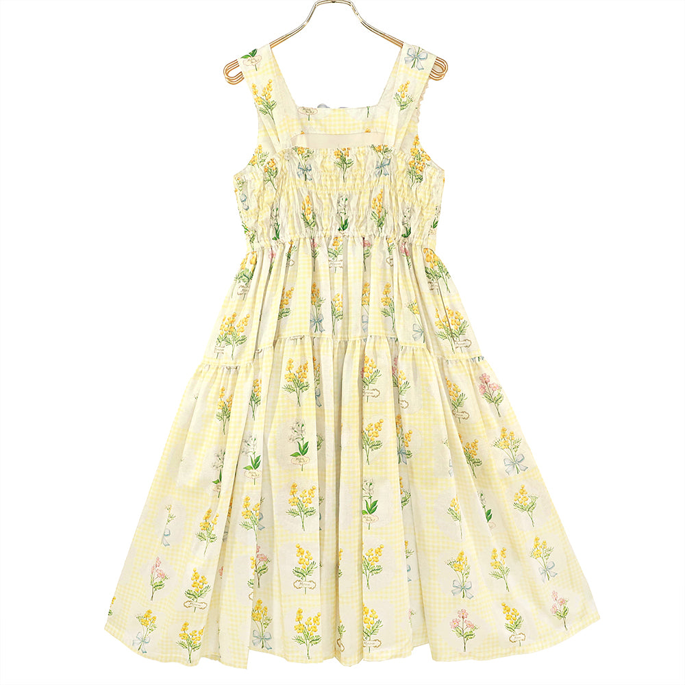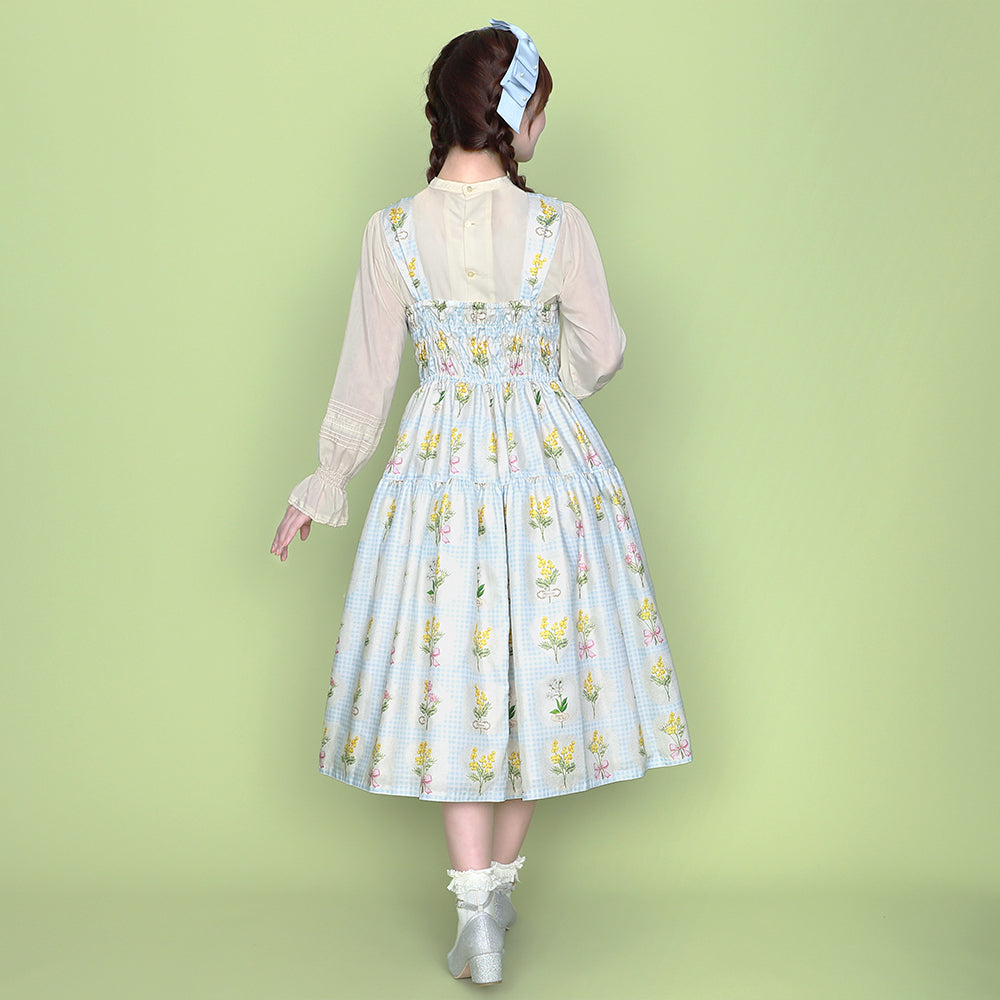 肩紐調節可能。後ろゴムシャーリング仕様。スカート右脇ポケット付き。