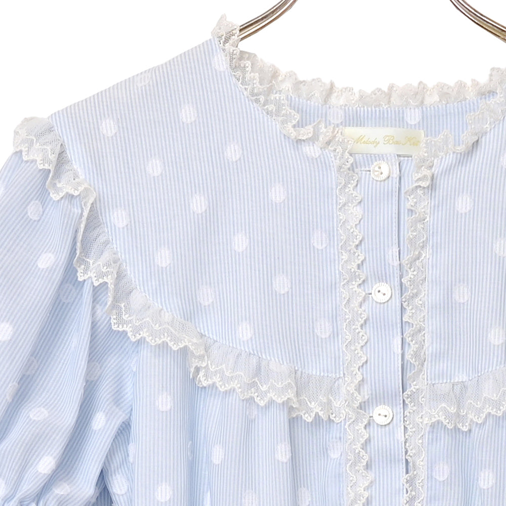 チュールレースをあしらったラグランヨーク切替で、落ち着いた可愛らしさを演出します。