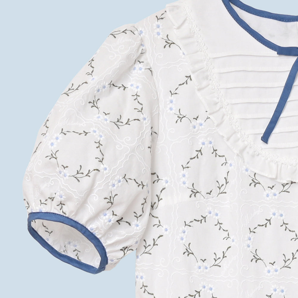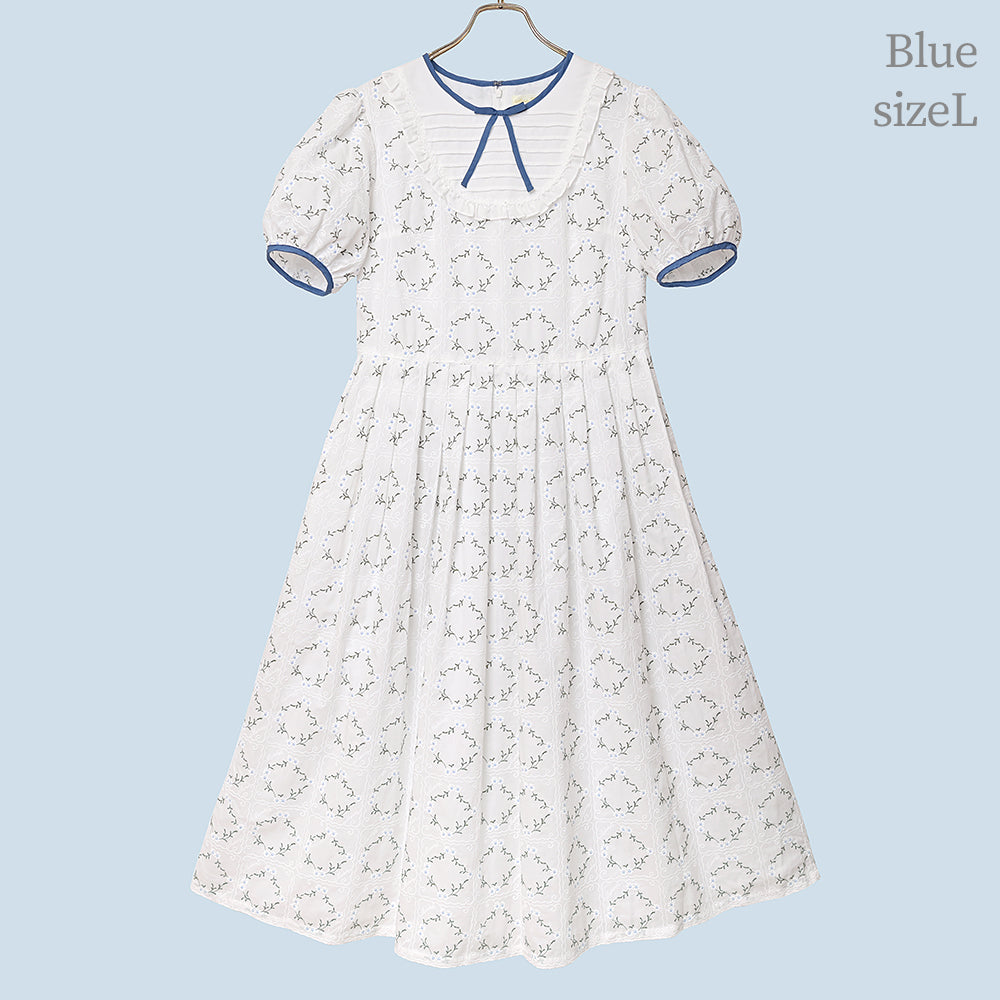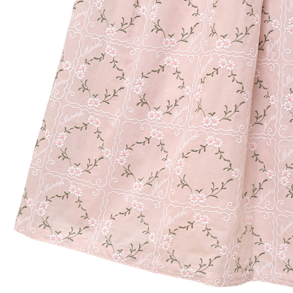 刺繍の花々が寄り添い、やさしい旋律のような物語を紡ぎます。