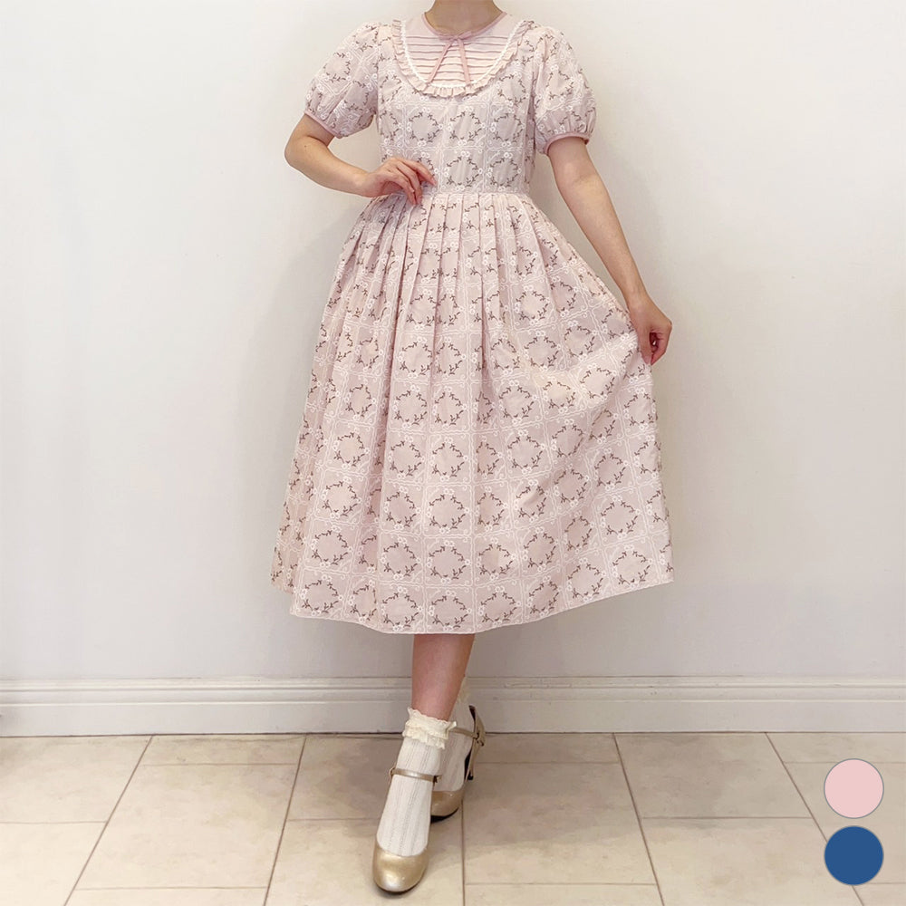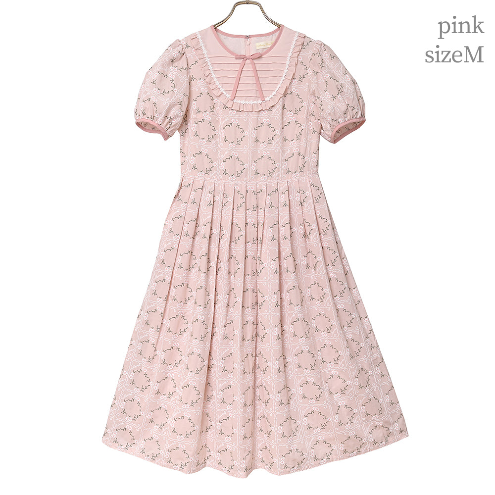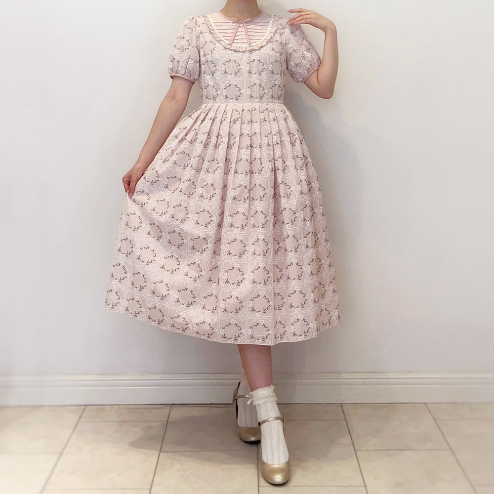 ピンタックとレースをあしらった、ラウンドヨーク切替がポイントのワンピース。