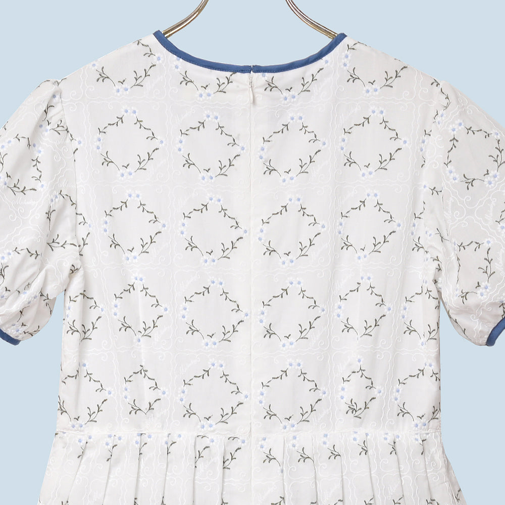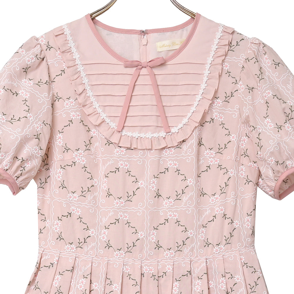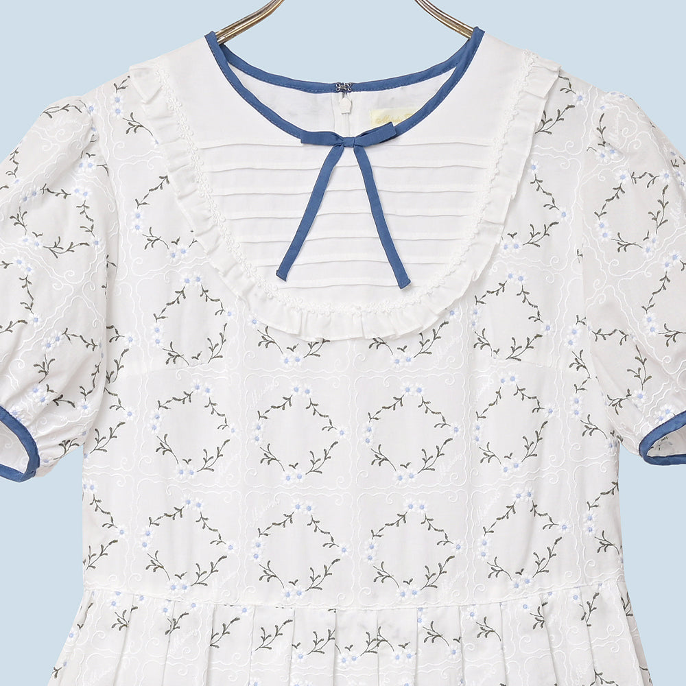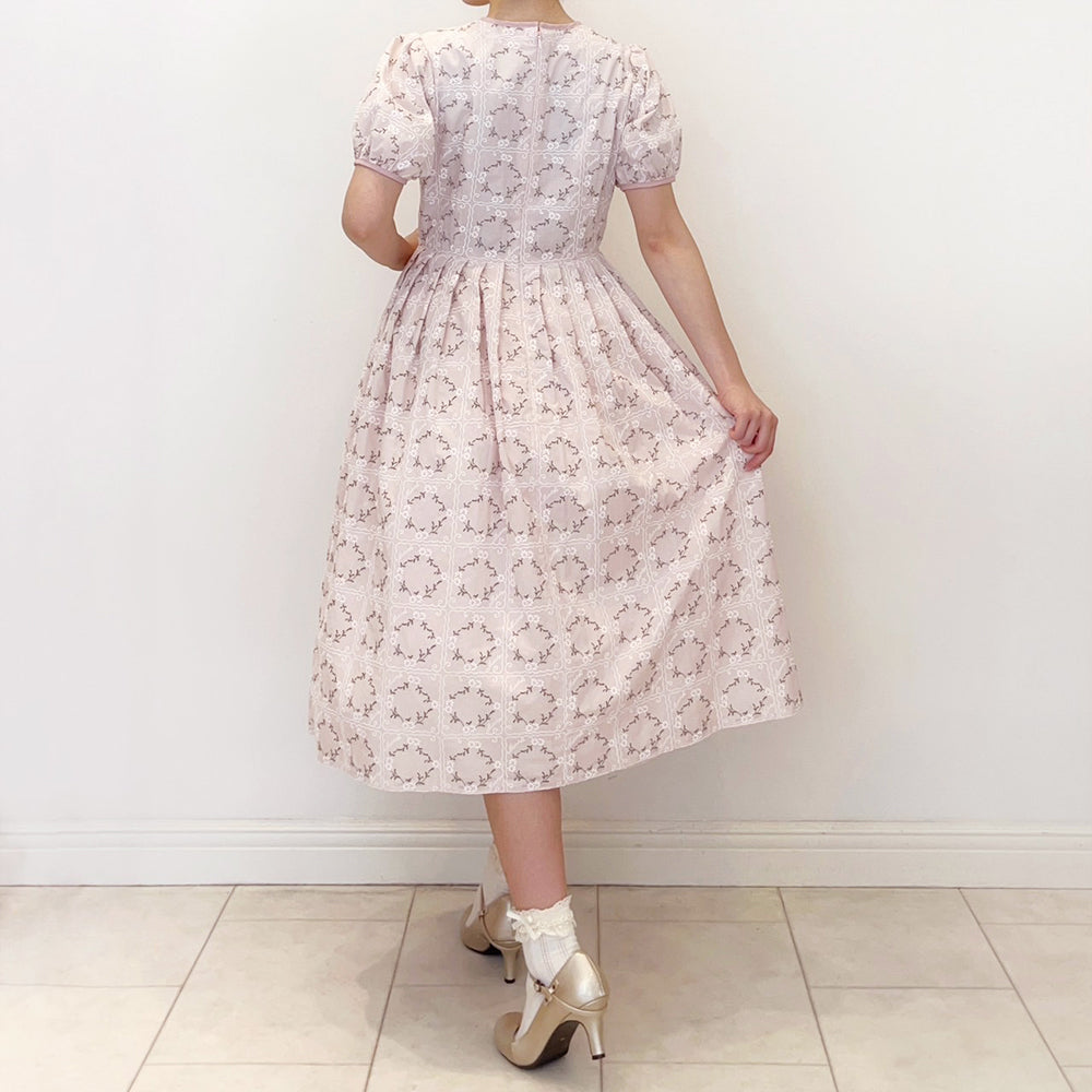 ピンタックとレースをあしらった、ラウンドヨーク切替がポイントのワンピース。