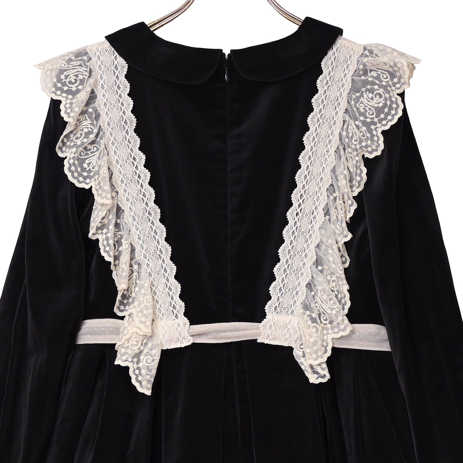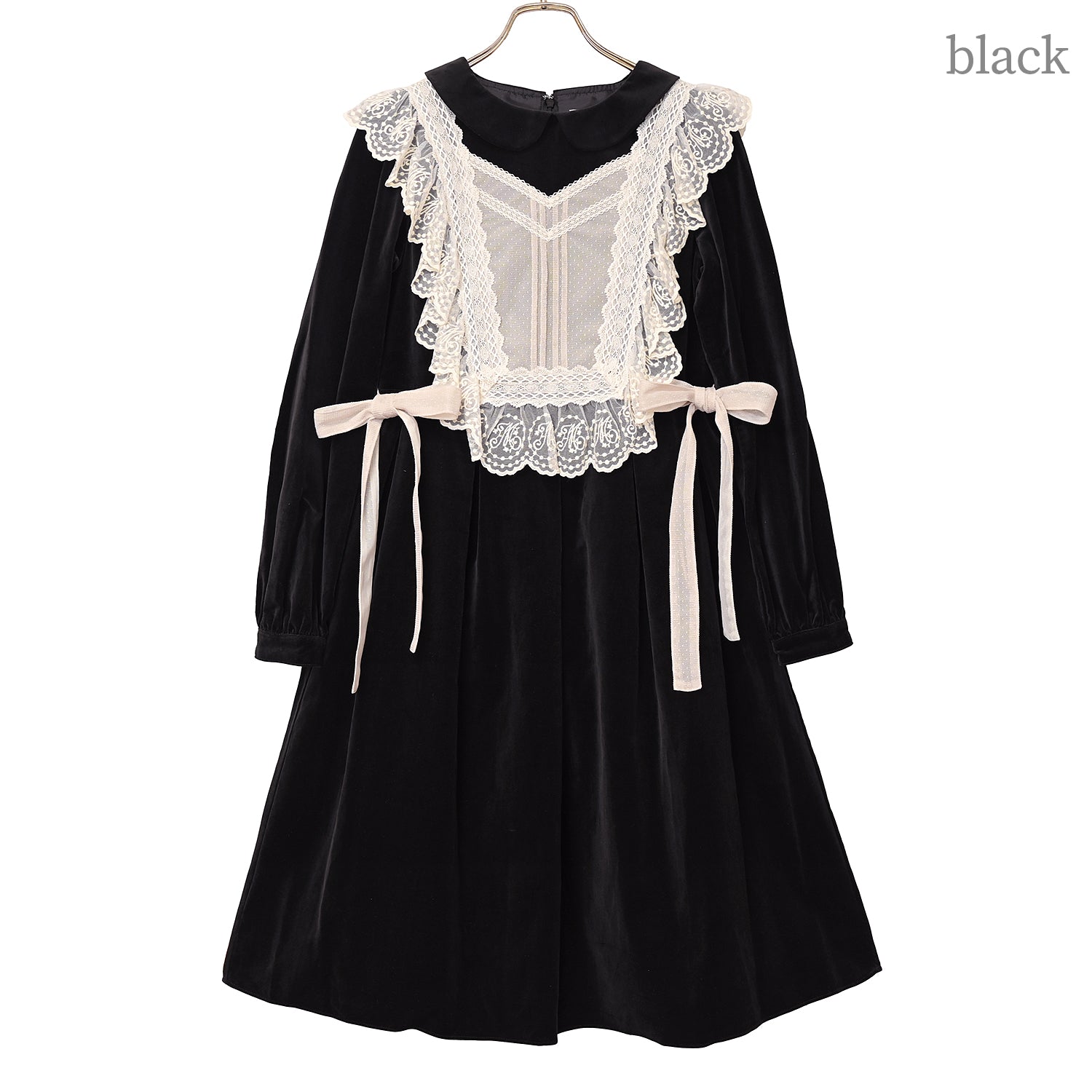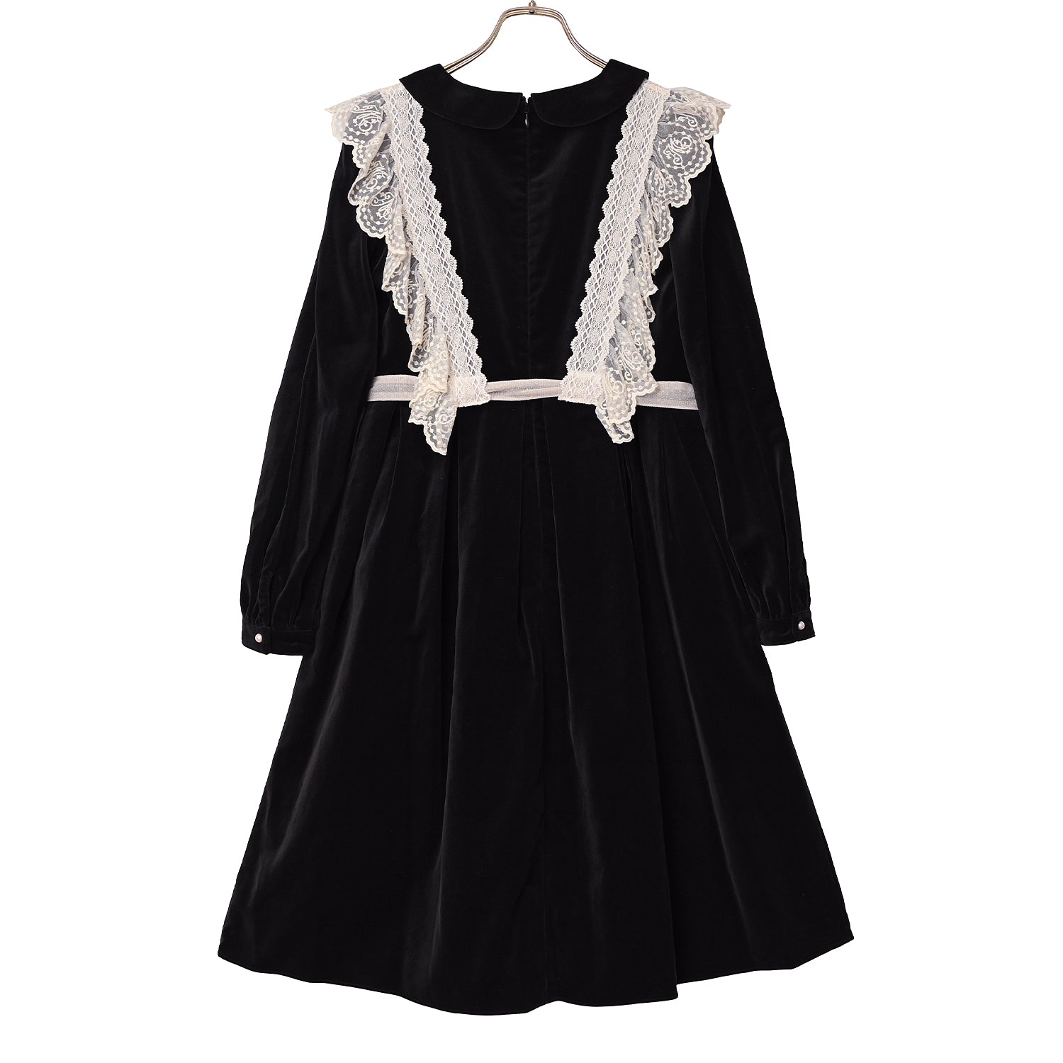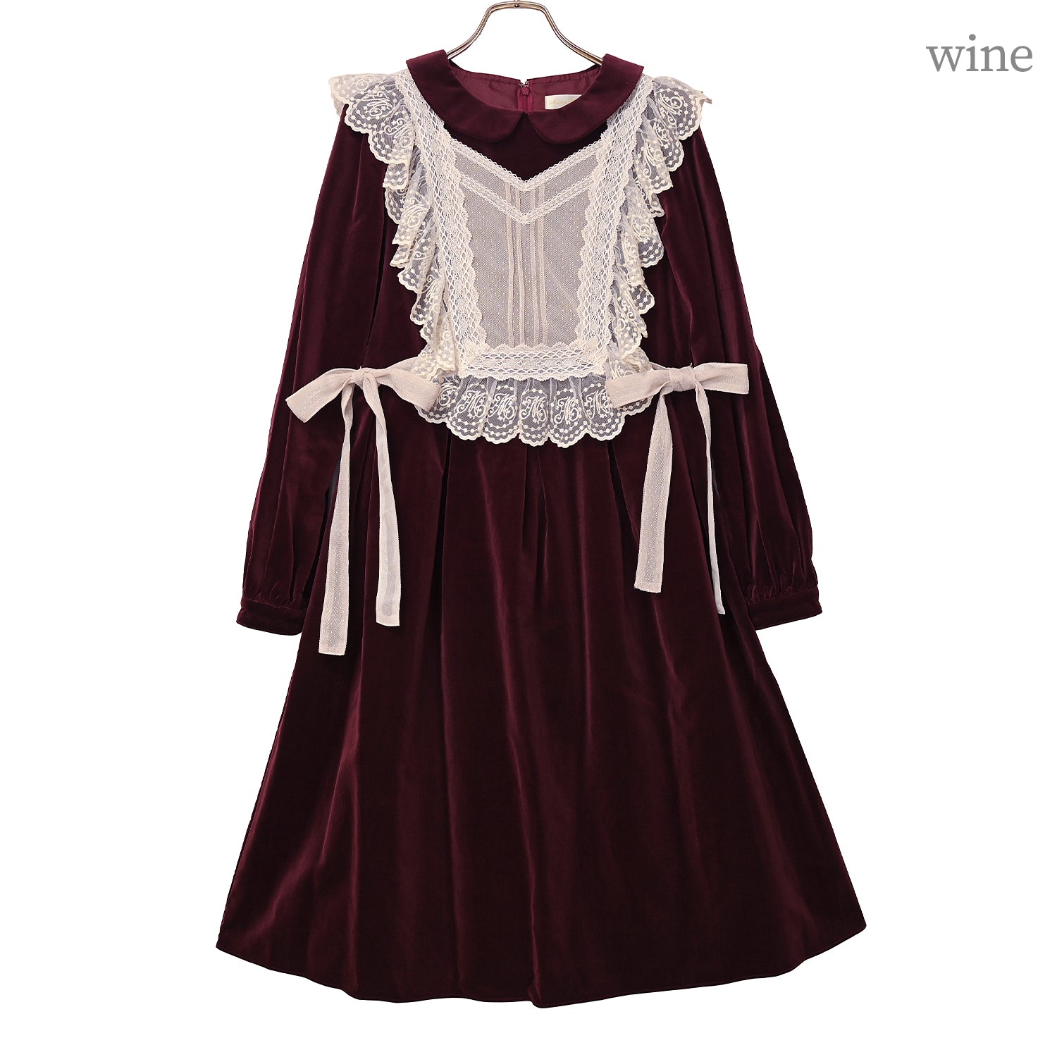 オリジナルレースを使用した華やかなジレが目を惹く、別珍素材のワンピース。