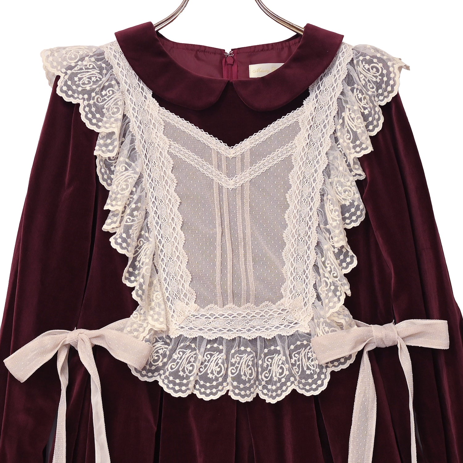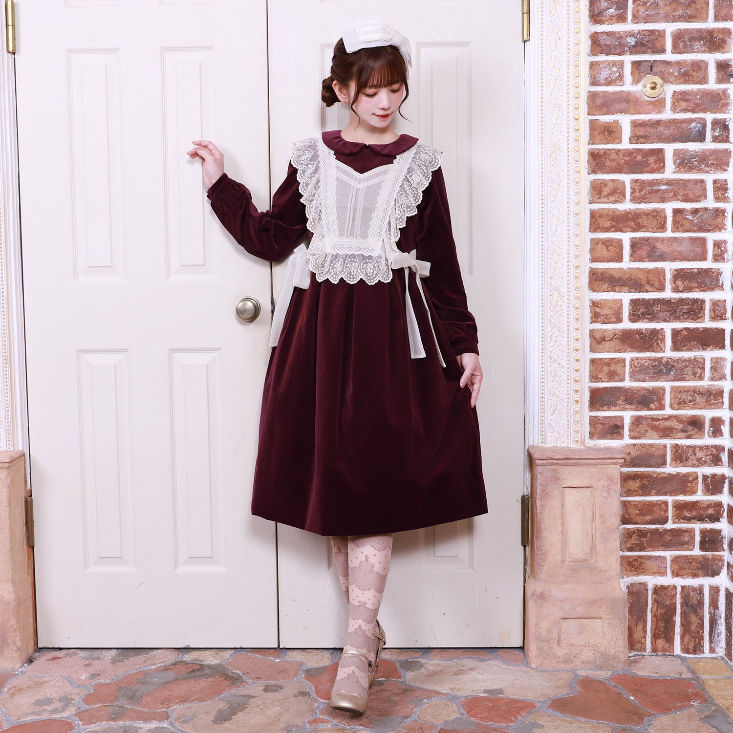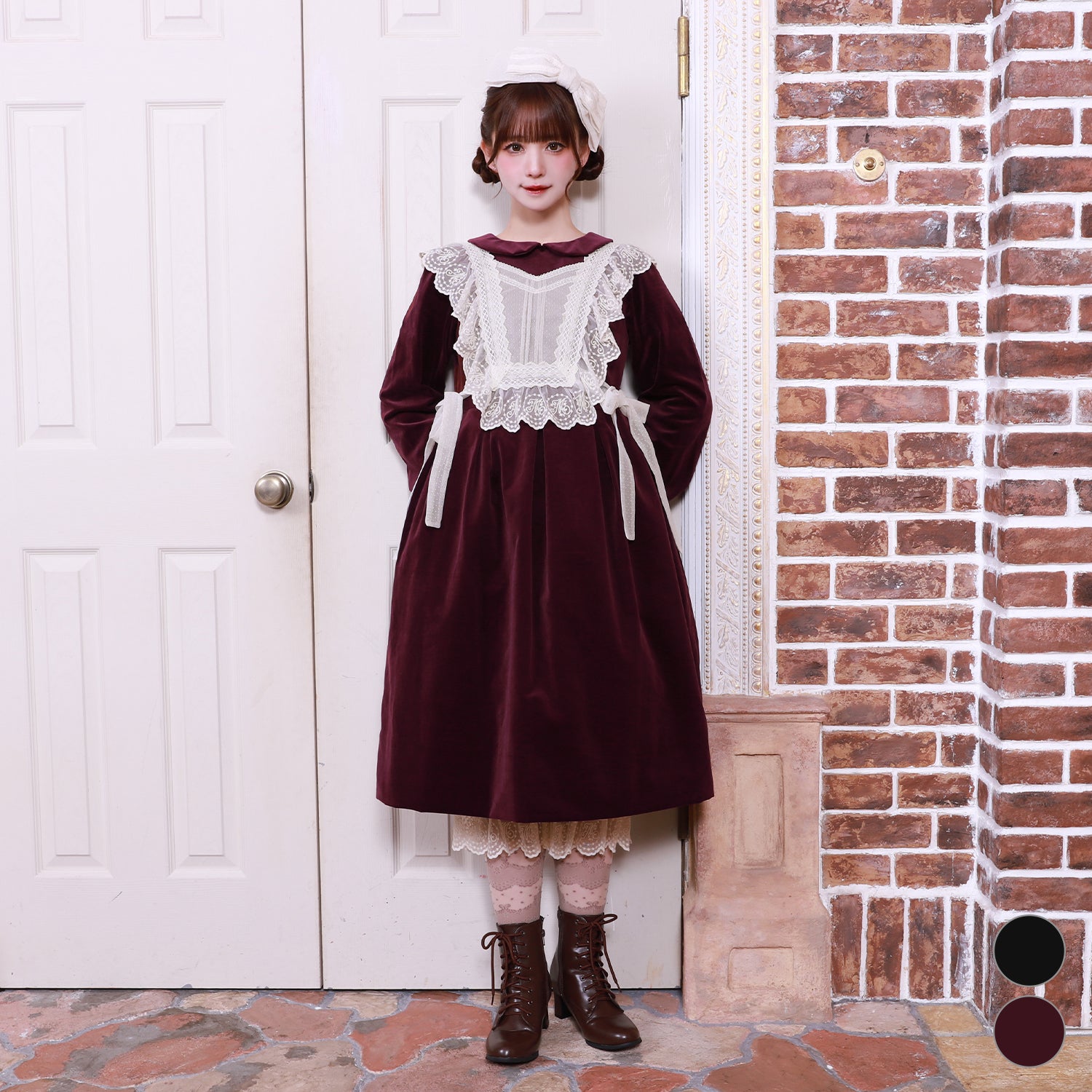 オリジナルレースを使用した華やかなジレが目を惹く、別珍素材のワンピース。