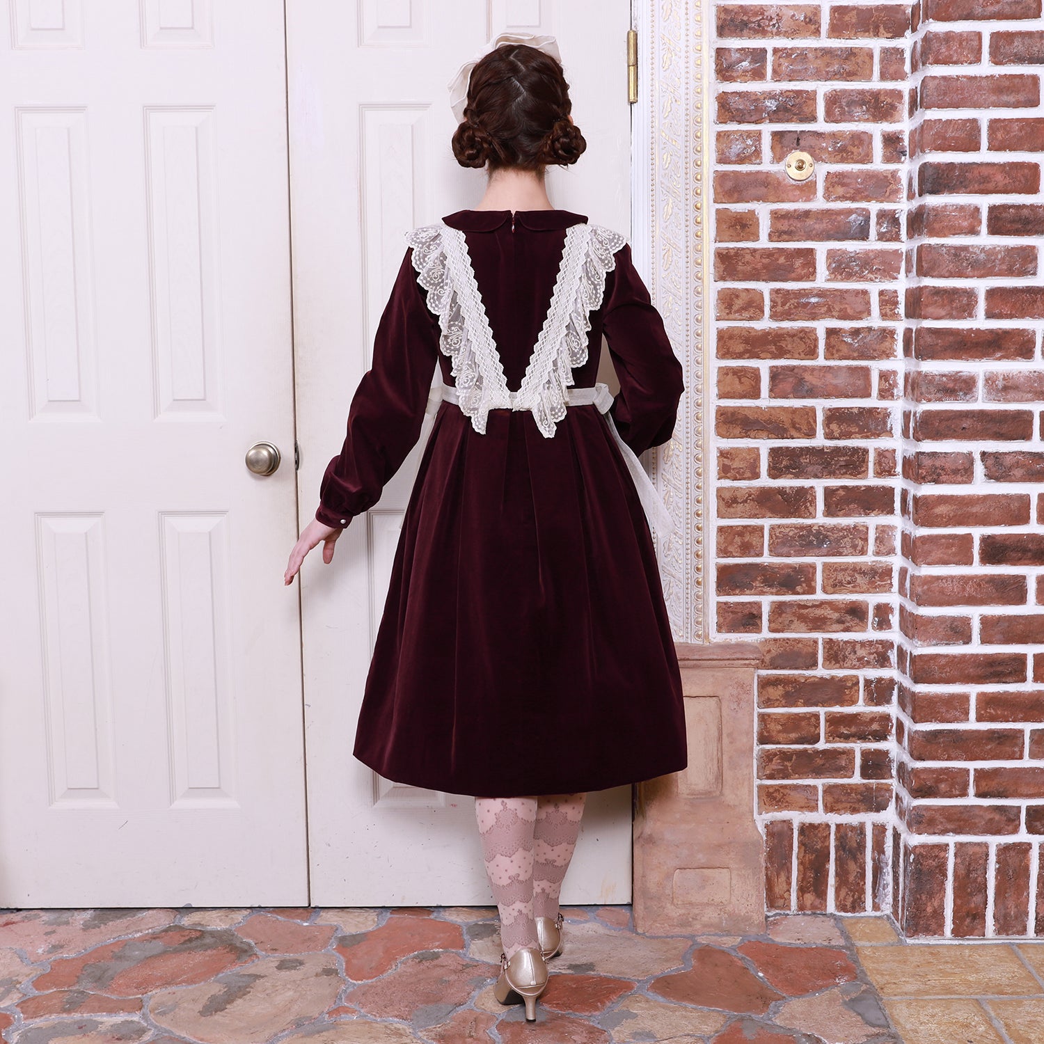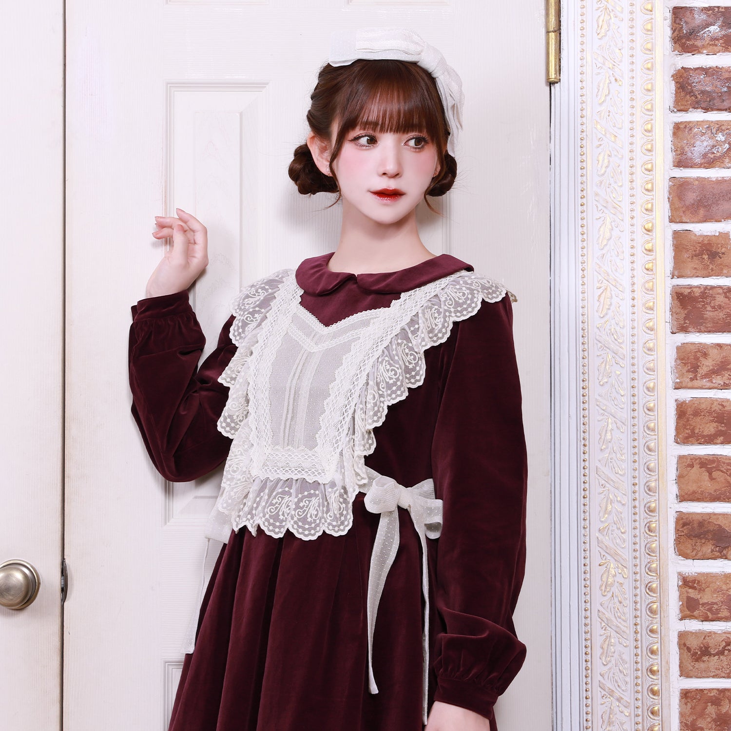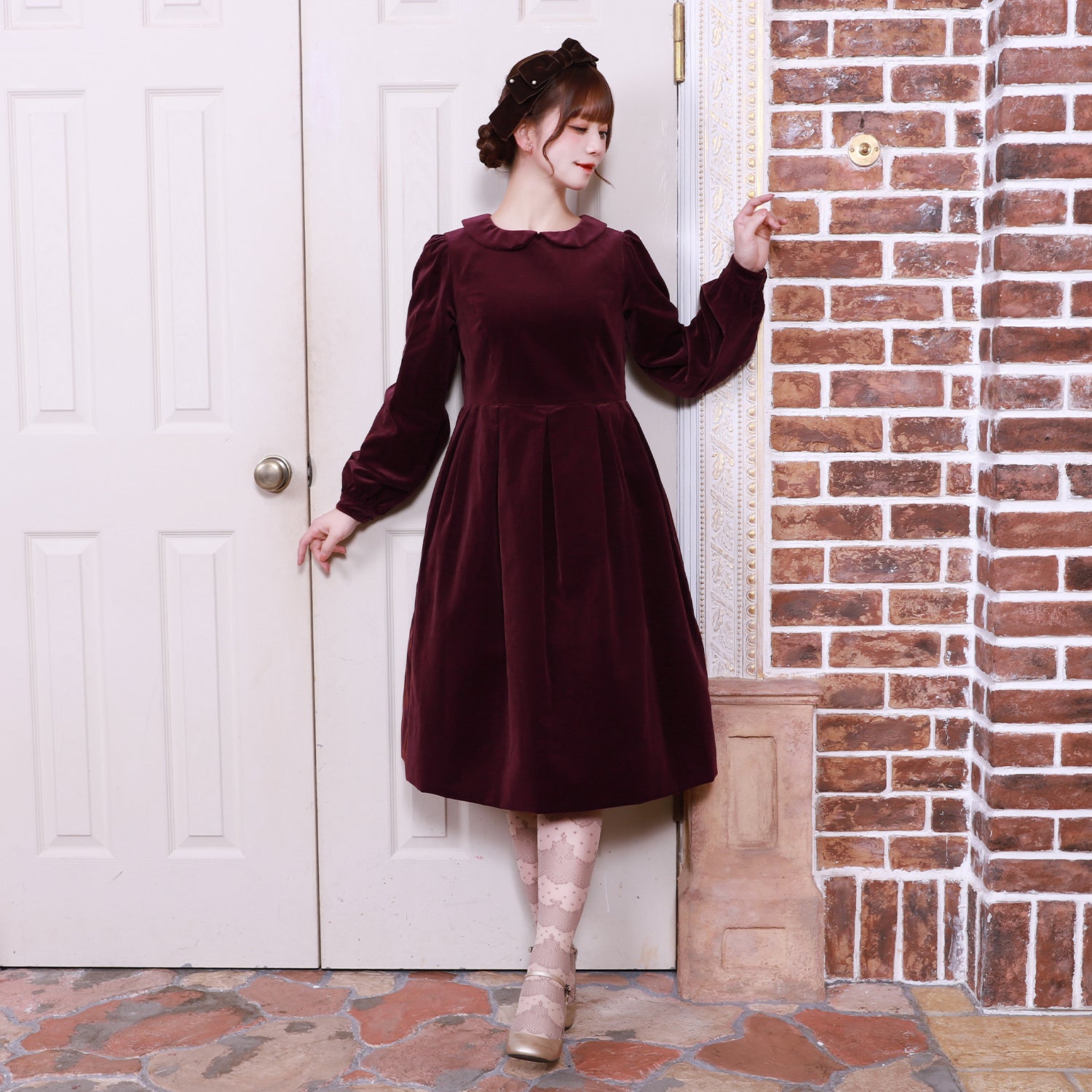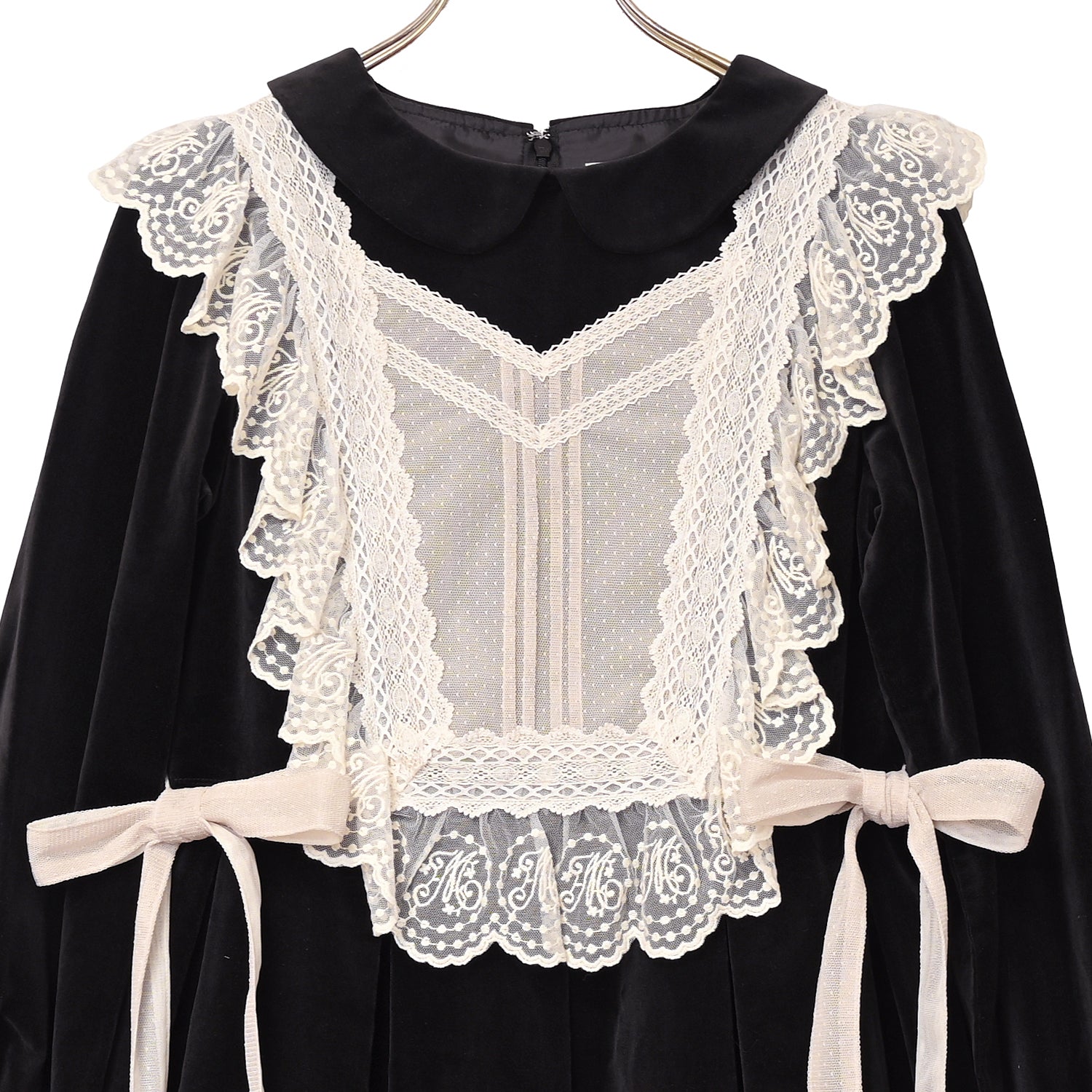 オリジナルレースを使用した華やかなジレが目を惹く、別珍素材のワンピース。