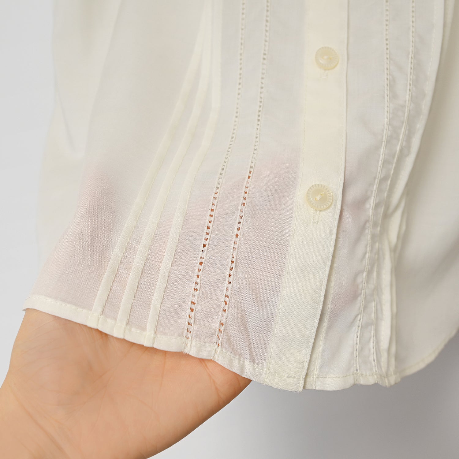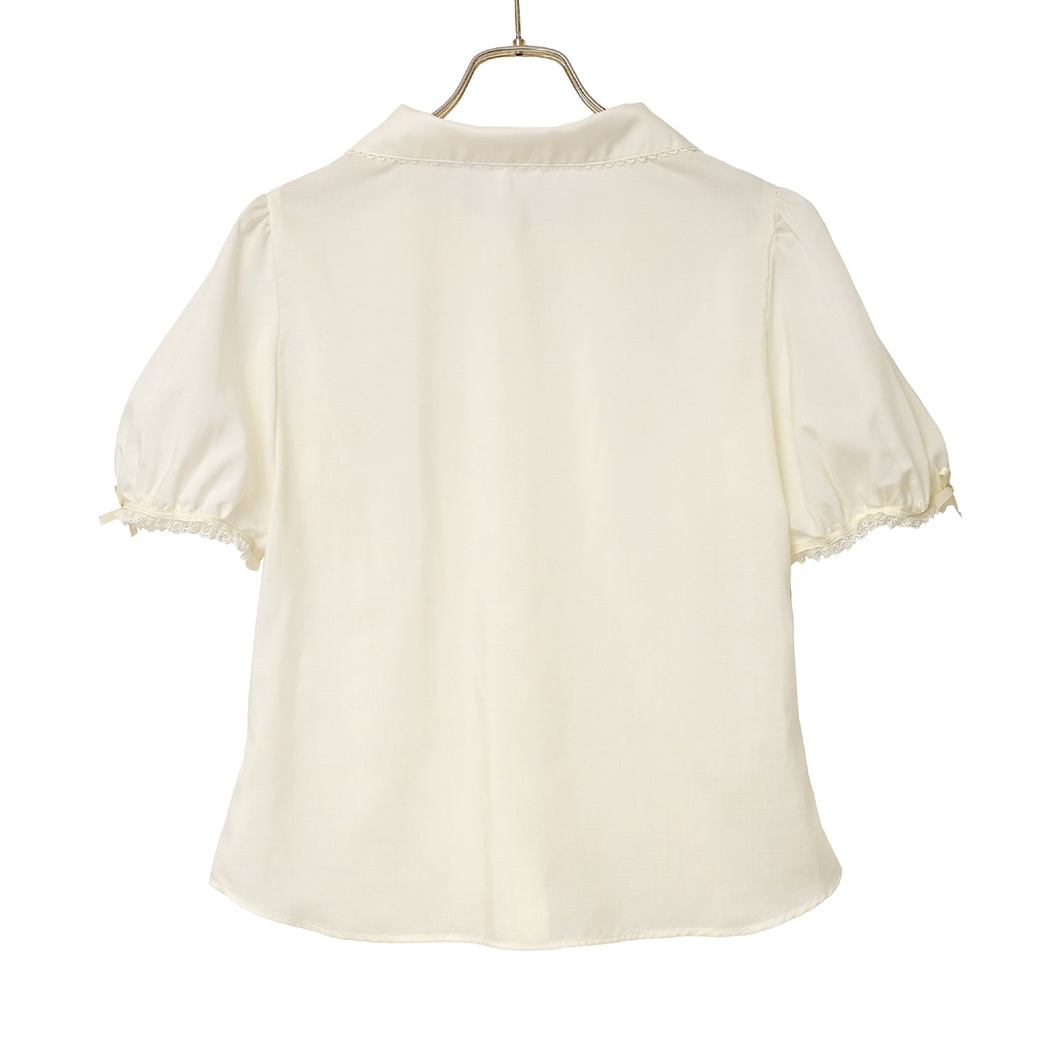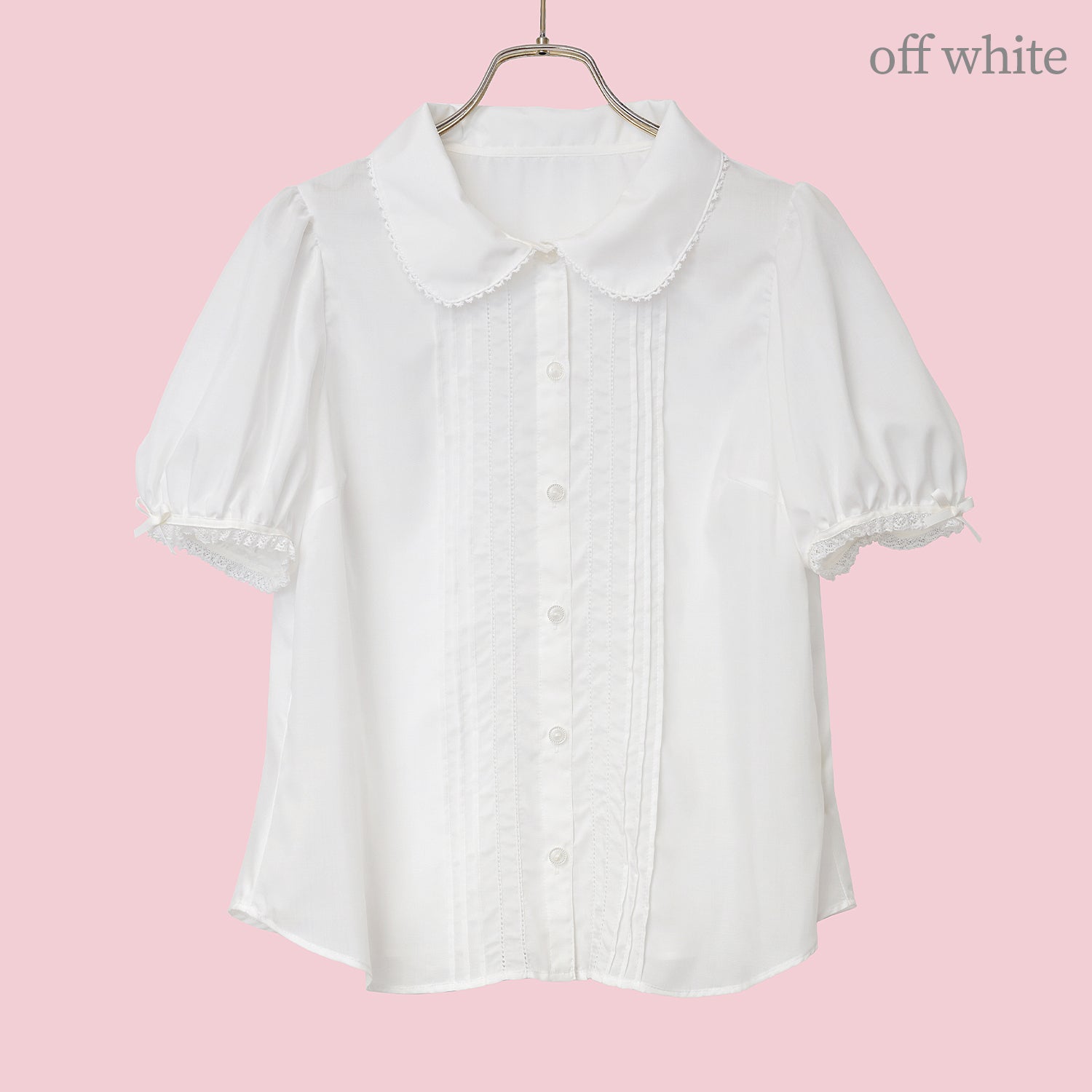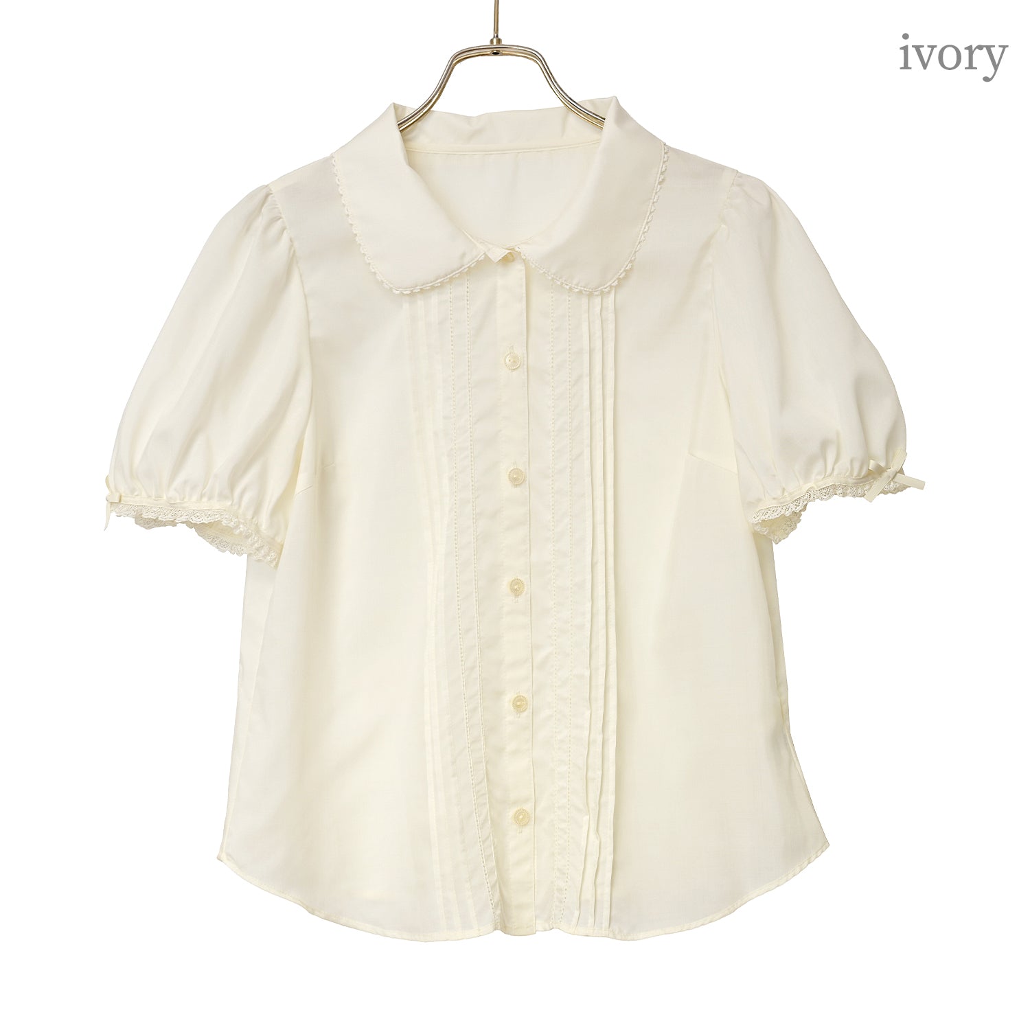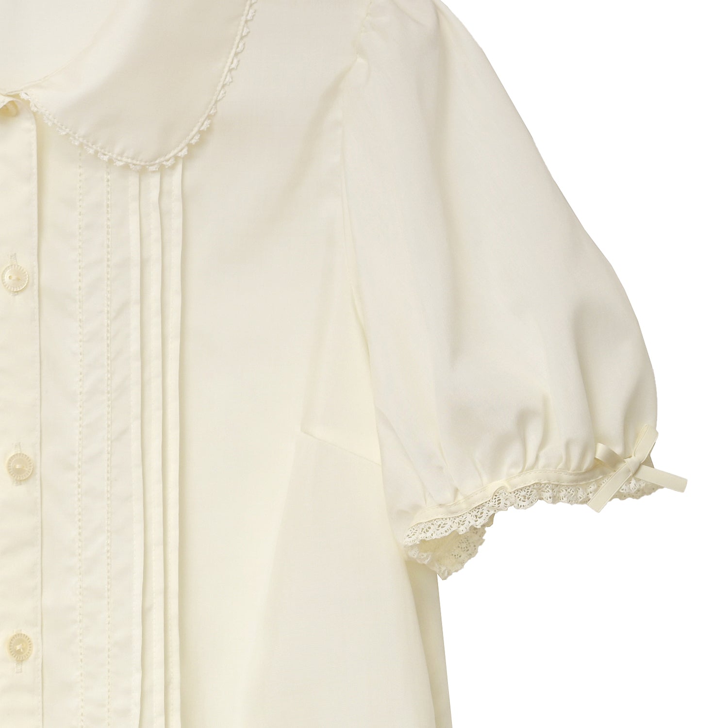 袖にはレースとリボン、身頃にはピンタックとピコミシンがあしらわれており、1枚でも様になります。