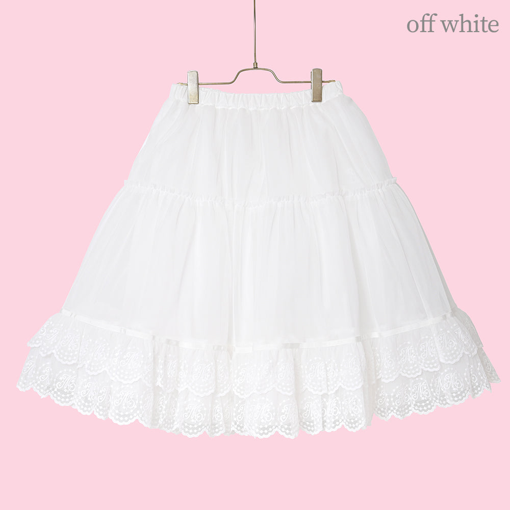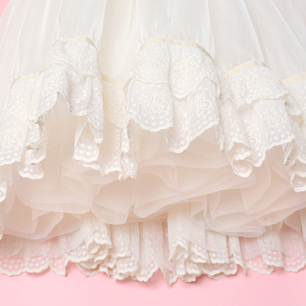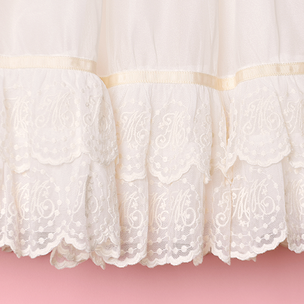 柔らかなチュールとオーガンジーを幾重にも重ね、裾にはオリジナルレースをふんだんにトッピング。