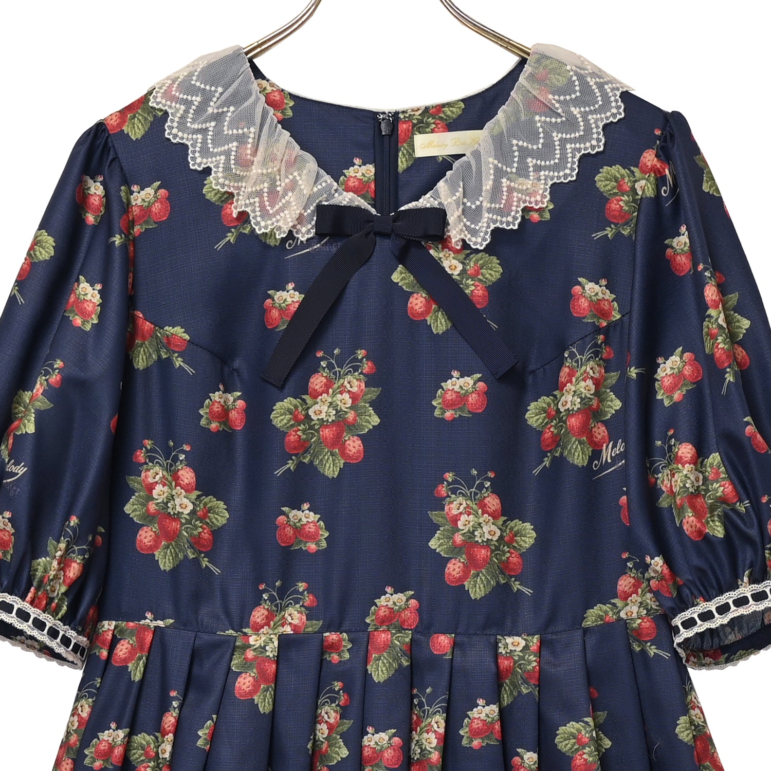 胸元にはリボン、袖口にはハシゴレースをあしらいました。