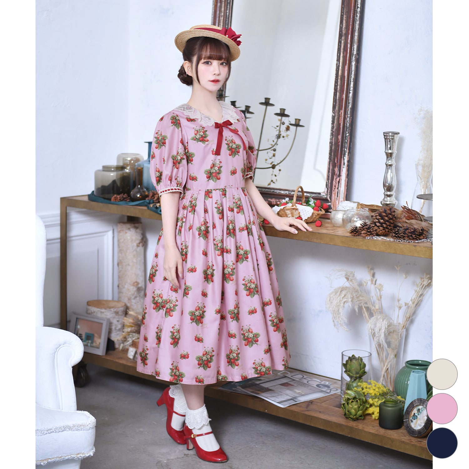 可愛らしいイチゴを散りばめたオリジナルプリントシリーズ。