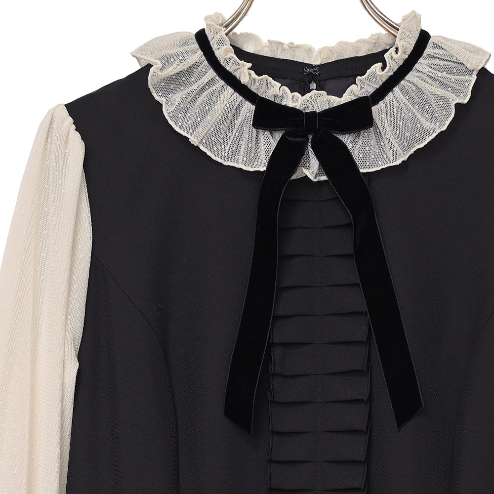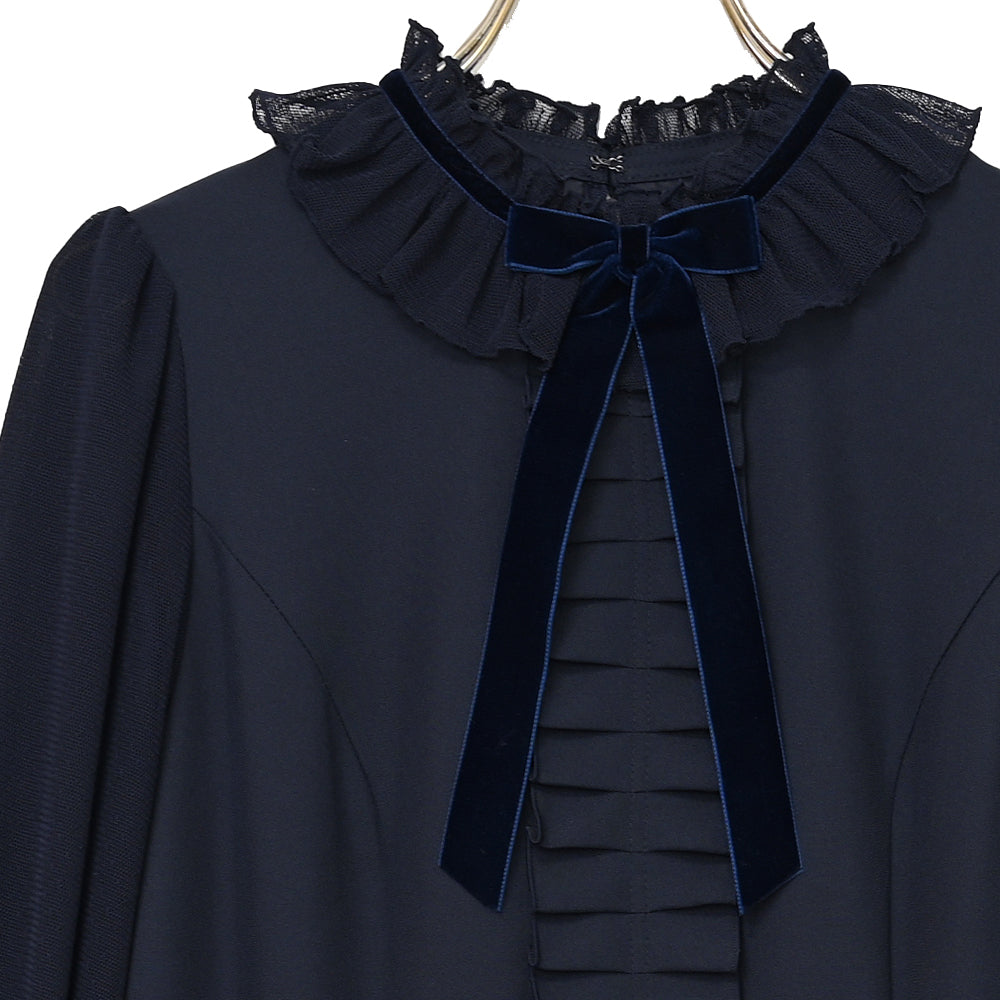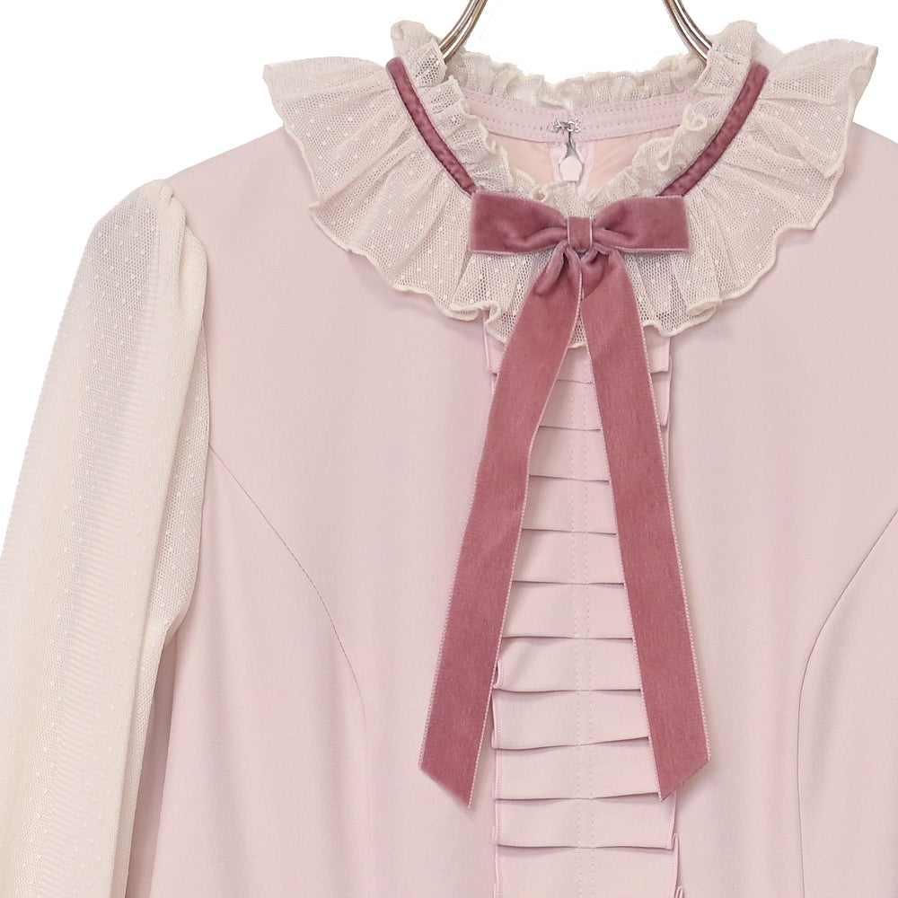 フロントのタックフリルとベルベットリボン使いがアクセント。