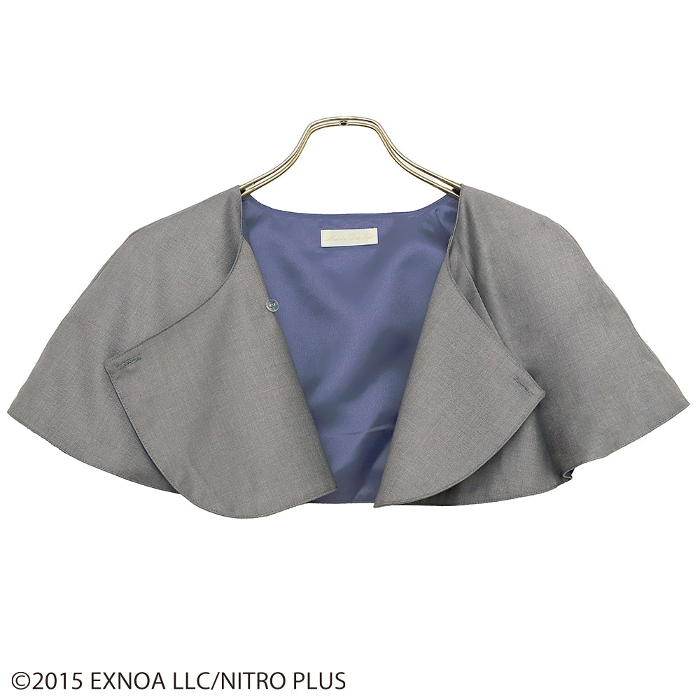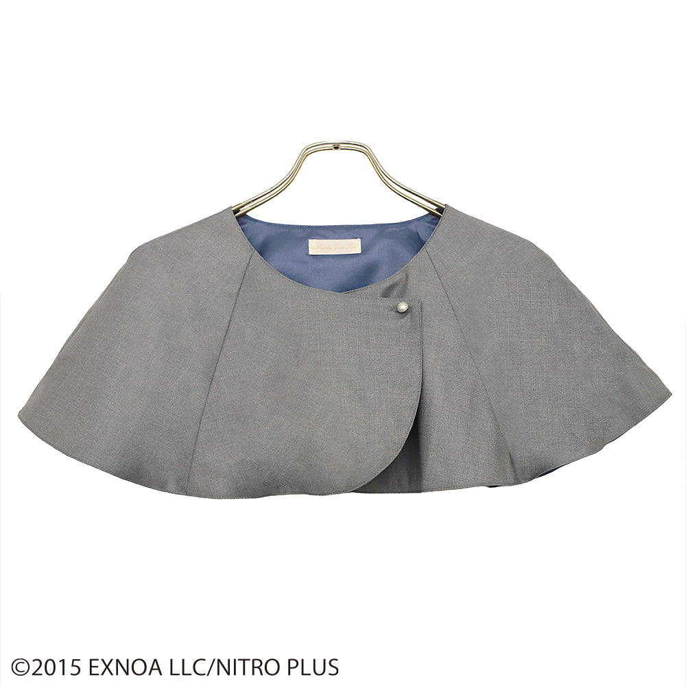 ブルーの裏地が効いたケープは取り外し可能。外すとモノトーンのシックなワンピースとしてご着用いただけます。